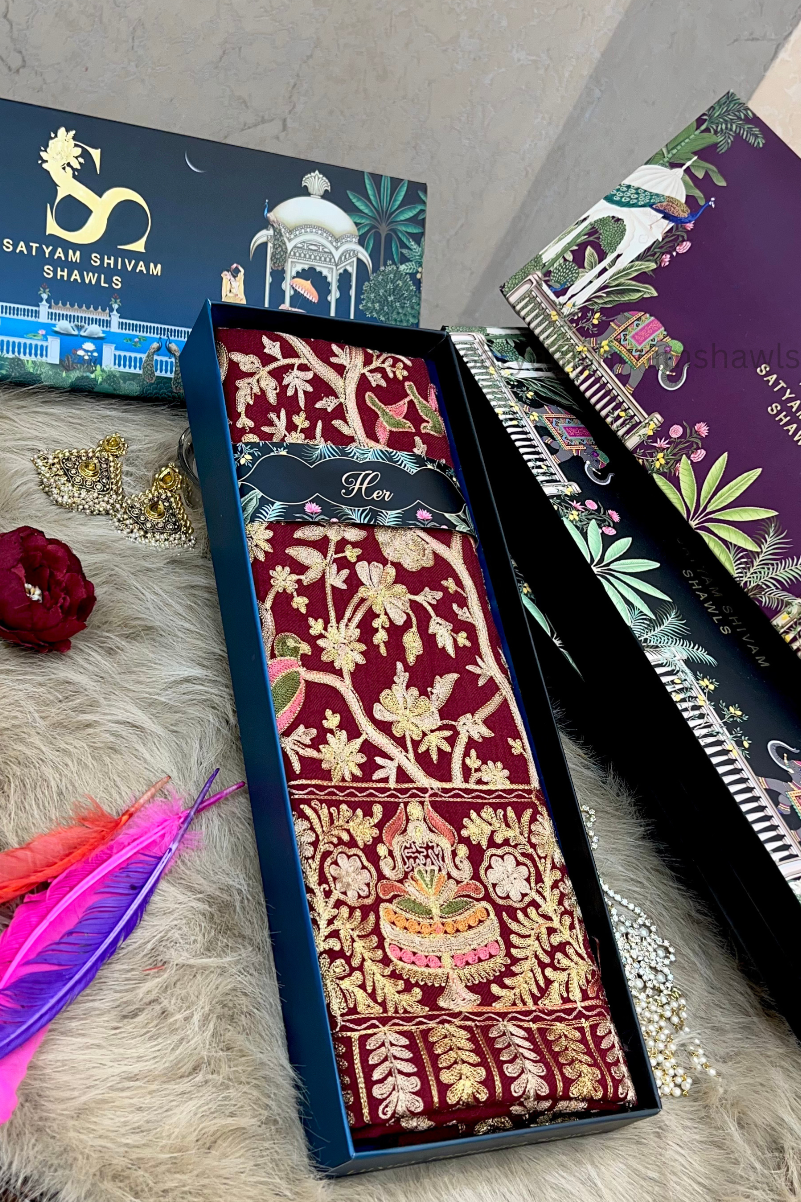 BIRDS OF HEAVEN ARABIC DESIGN NALKI ZARI EMBROIDERY STOLE,MEHROON