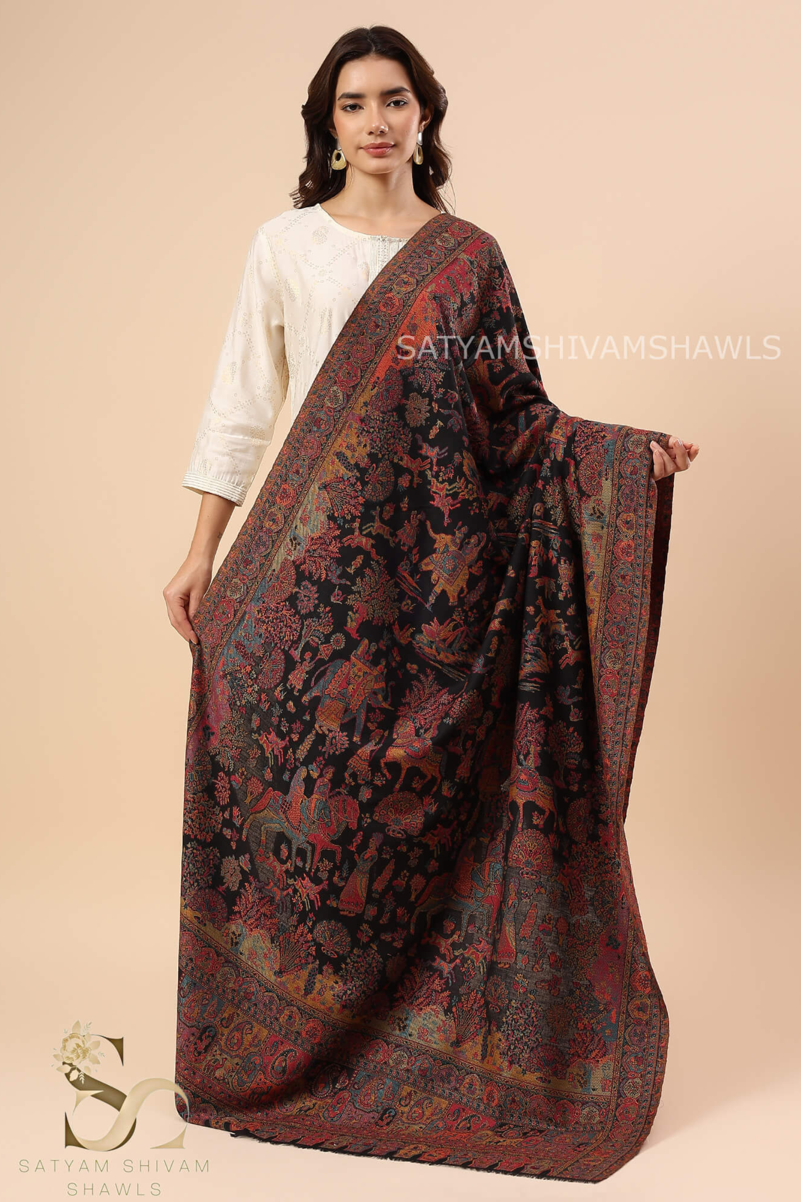 SHIKAADAR KASHMIRI KANI WOVEN BLACK SHAWL WITH VINTAGE COLOUR KANI WEAVED.