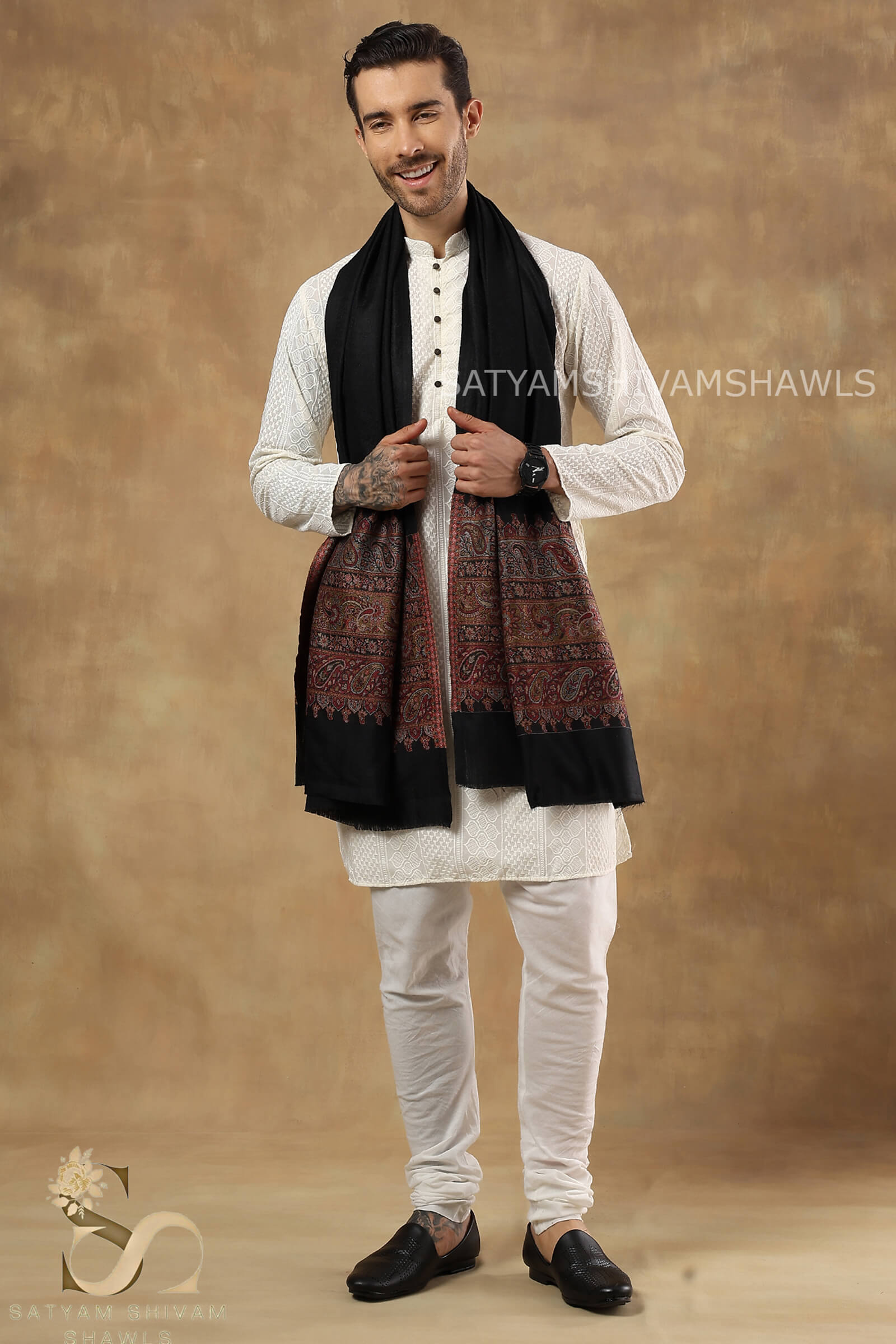 Crafted from extra fine wool, this black Kashmiri paisley palla men's stole exemplifies traditional artistry and refined elegance. Its intricate paisley design showcases expert weaving techniques, offering both warmth and a sophisticated accessory for formal or casual wear. Ideal for those who appreciate heritage craftsmanship combined with luxurious comfort.