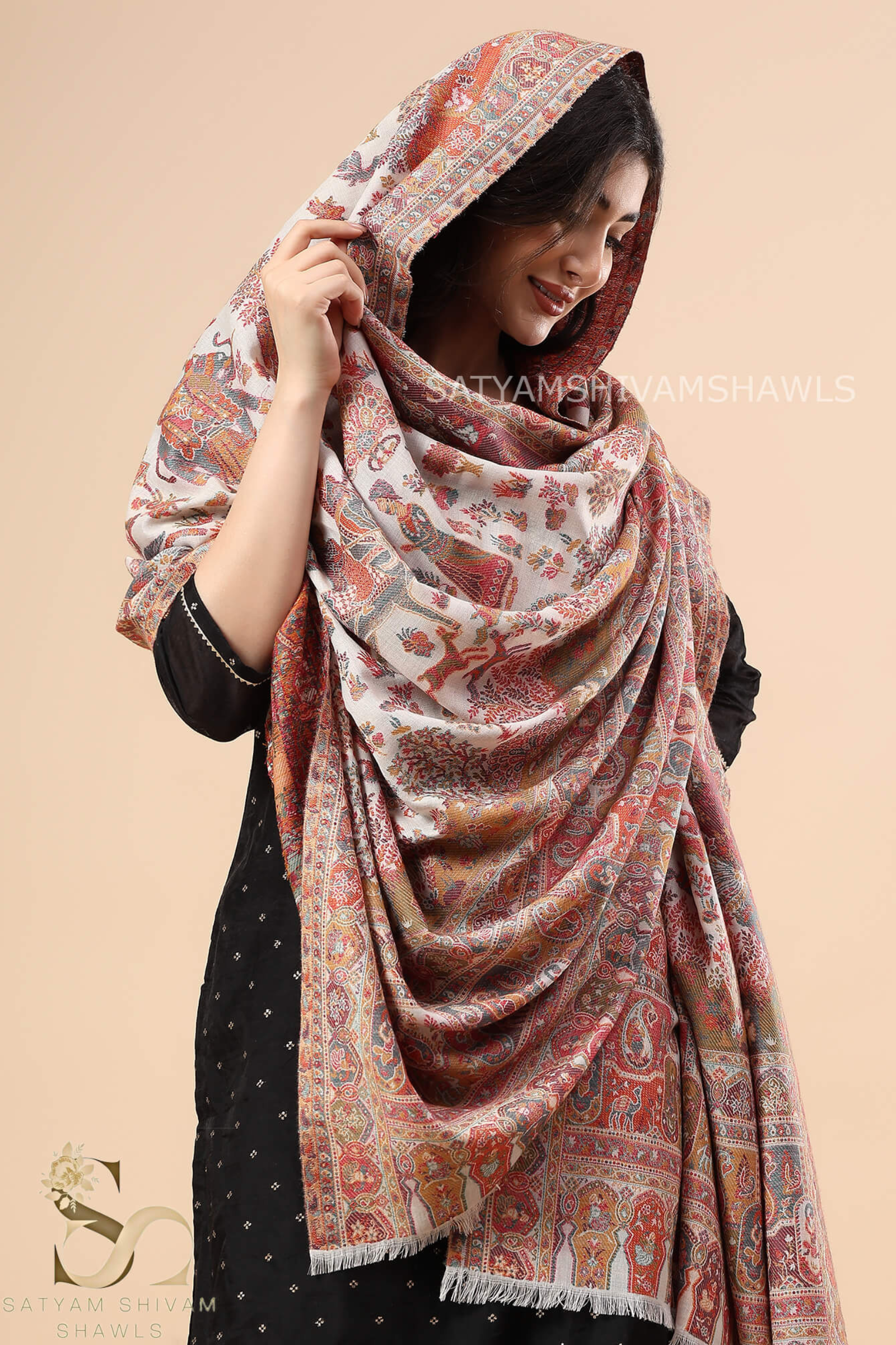"GARDEN OF DELIGHT" PASHMINA KANI SHIKARGAH DHOLI THEME DESIGN SHAWL,WARM AND SOFT,WHITE
