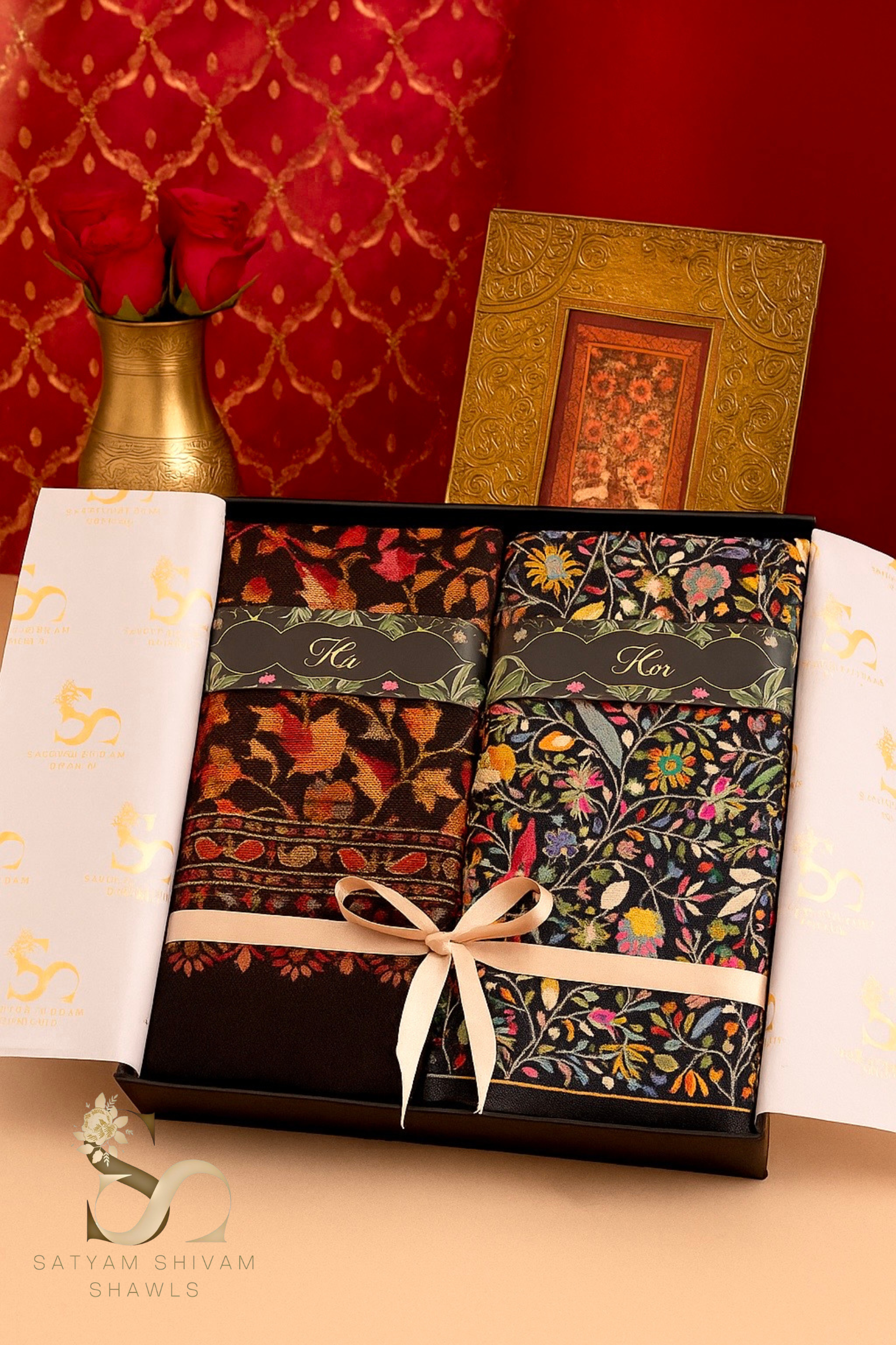 This exclusive his and her set features a men's pure wool Kani stole paired with a women's silk wool printed stole. The men's stole showcases traditional Kani craftsmanship, offering warmth and timeless elegance. Complementing it, the women's stole combines the softness of silk and wool with intricate prints, providing both comfort and style. Perfect for those who appreciate artisanal quality and coordinated fashion accessories.