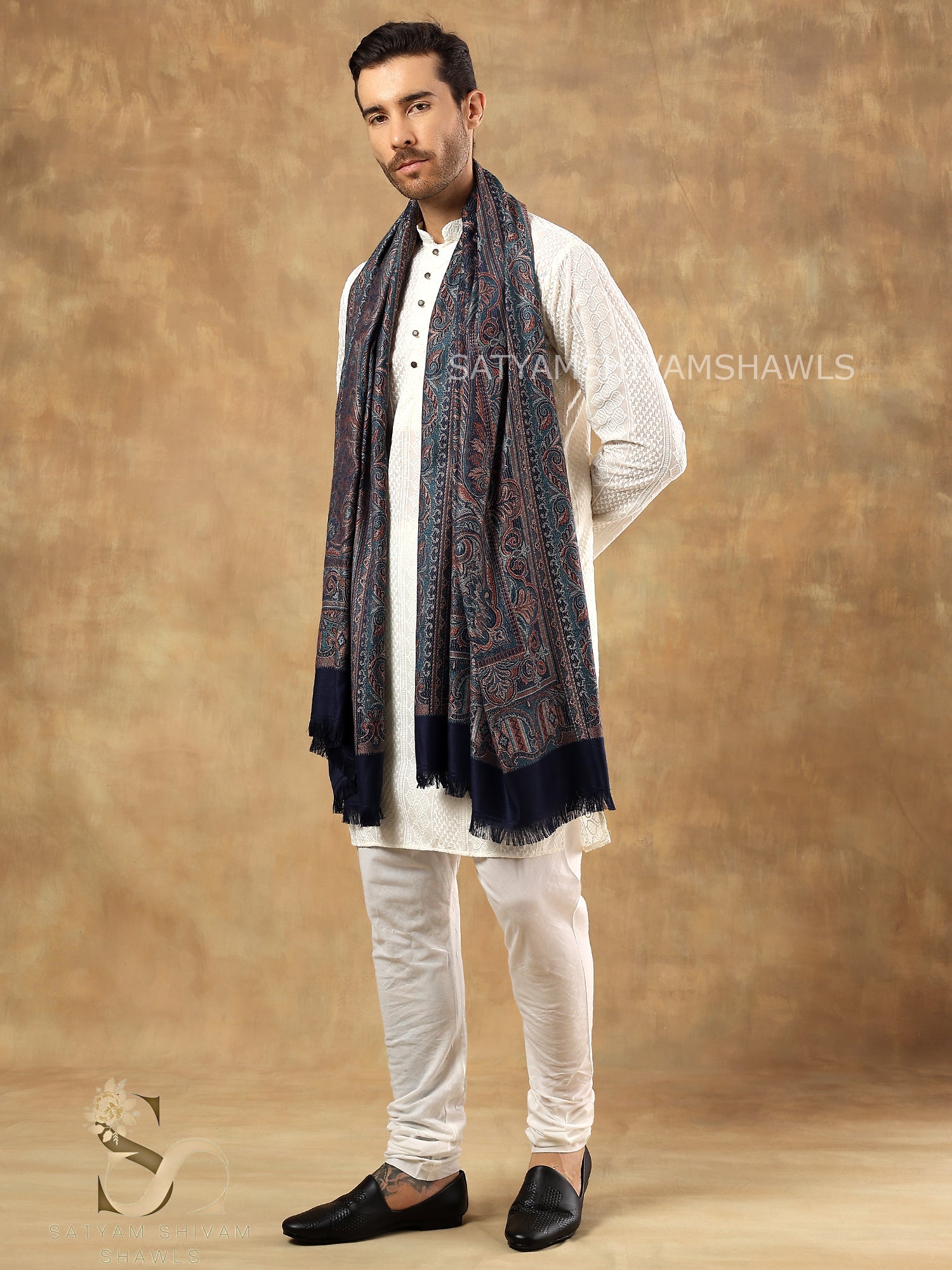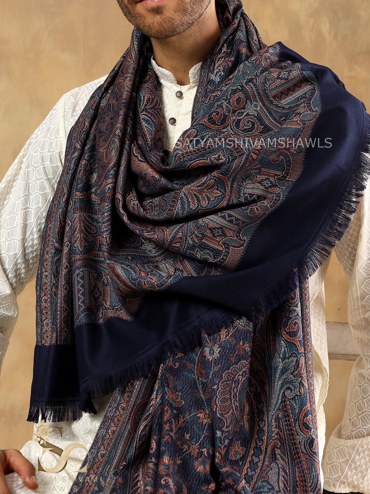 - Wrap yourself in the opulent beauty of this 100% Fine Wool shawl, certified by Woolmark, featuring a woven paisley pattern with an antique jamawar look in a graceful beige hue.