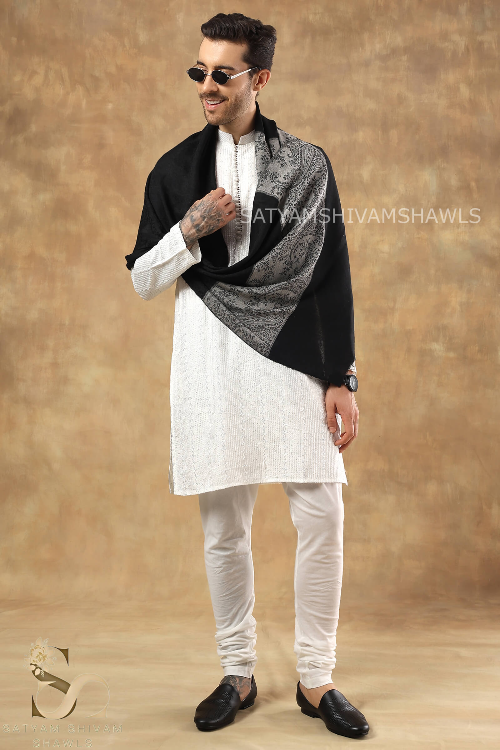 Elevate your style with the Kashmiri Black Self with Royal Skin Palla Luxury Pashmina Stole for men. Crafted from premium pashmina, this stole combines traditional Kashmiri artistry with refined elegance. Its deep black base paired with the distinctive royal skin palla detailing offers a sophisticated look, perfect for formal occasions or enhancing everyday attire. Experience unmatched warmth and softness, making it both a practical and luxurious accessory.
