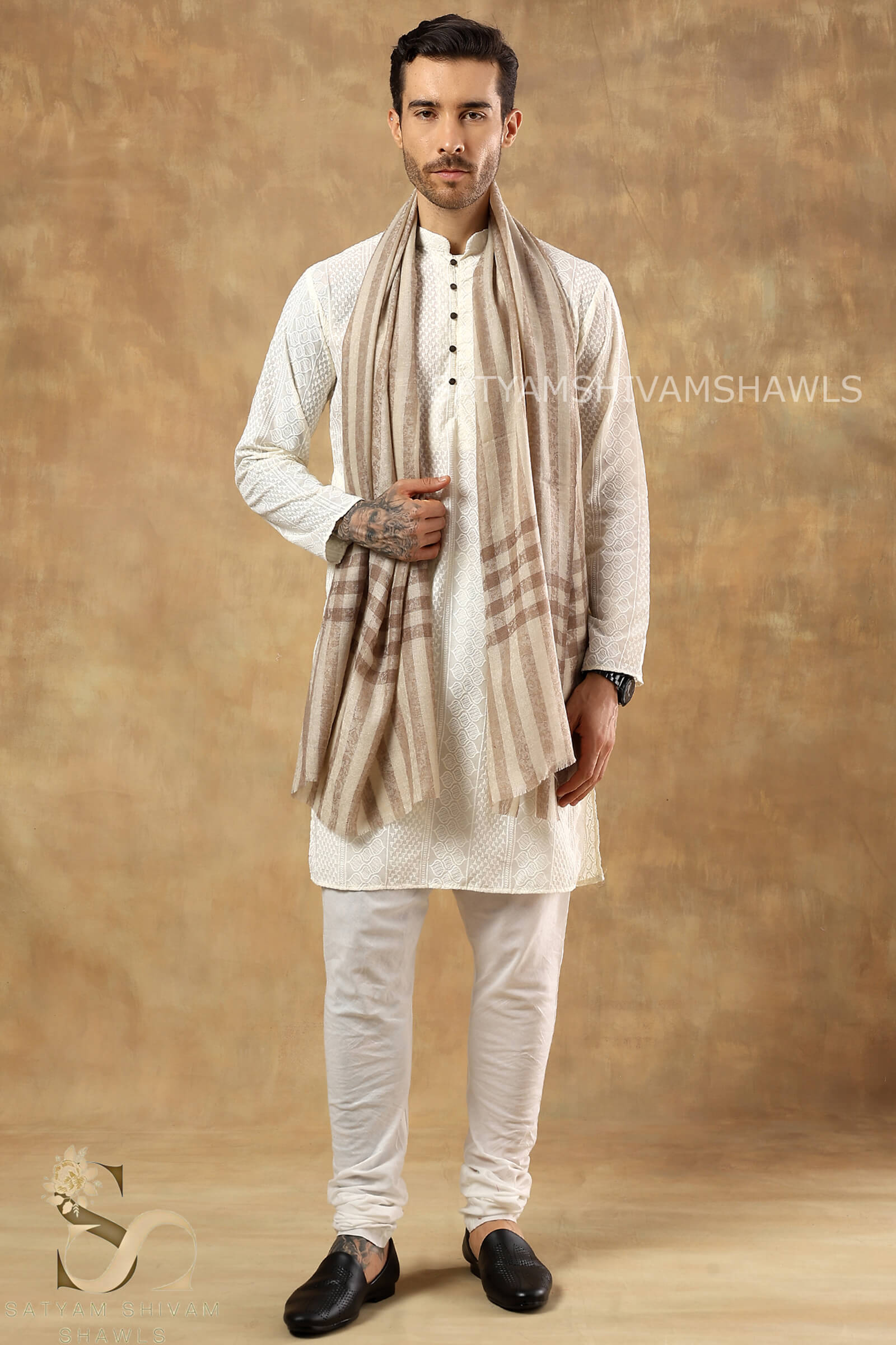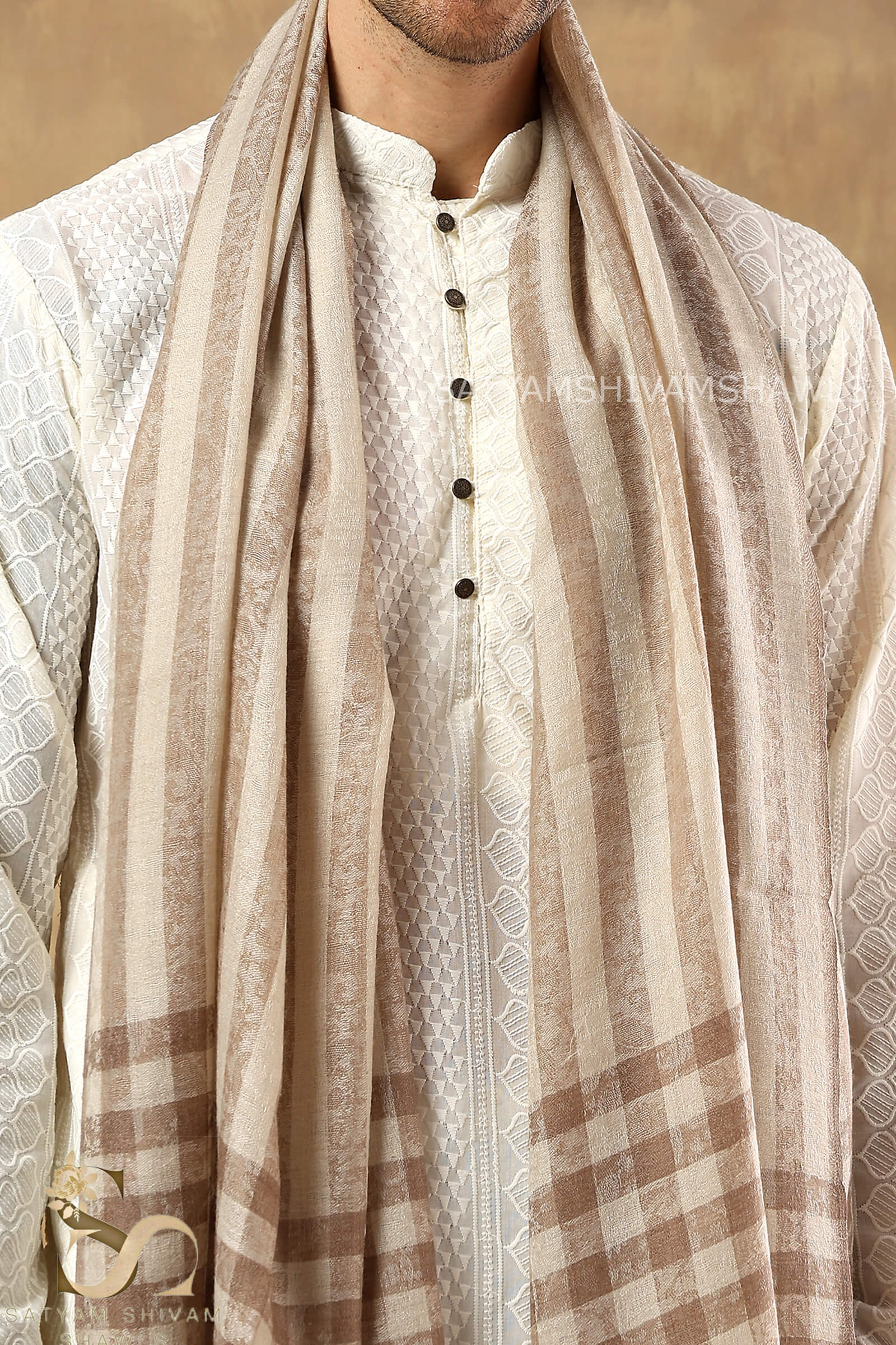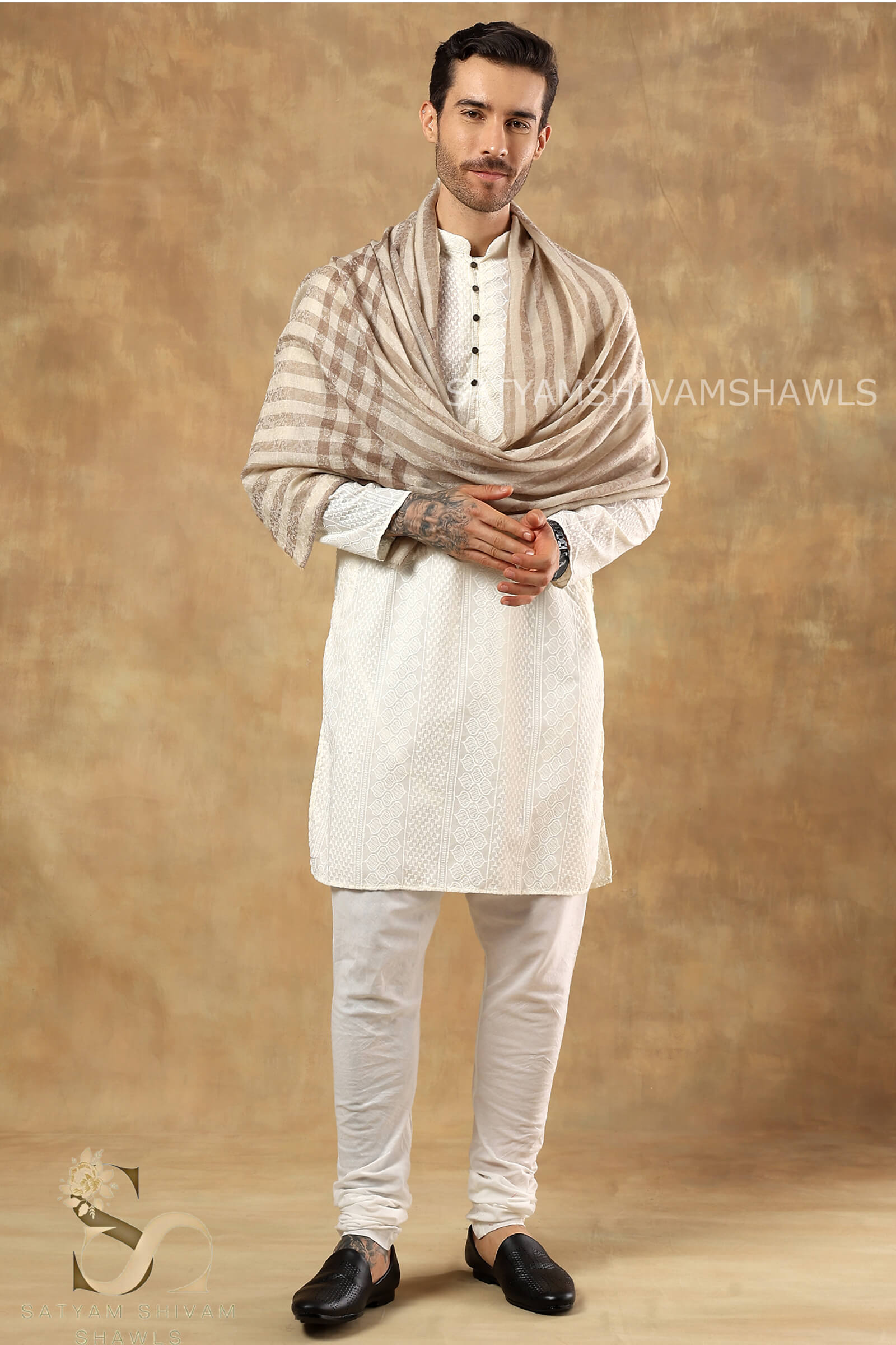 Elevate your style with this luxury pashmina men's stole in a refined skinish camel hue. Featuring subtle self stripes and a classic check palla, it combines traditional craftsmanship with contemporary elegance. Perfect for adding warmth and sophistication to any outfit, this stole offers both comfort and timeless appeal. Ideal for formal occasions or casual layering, it reflects expert tailoring and premium quality materials.