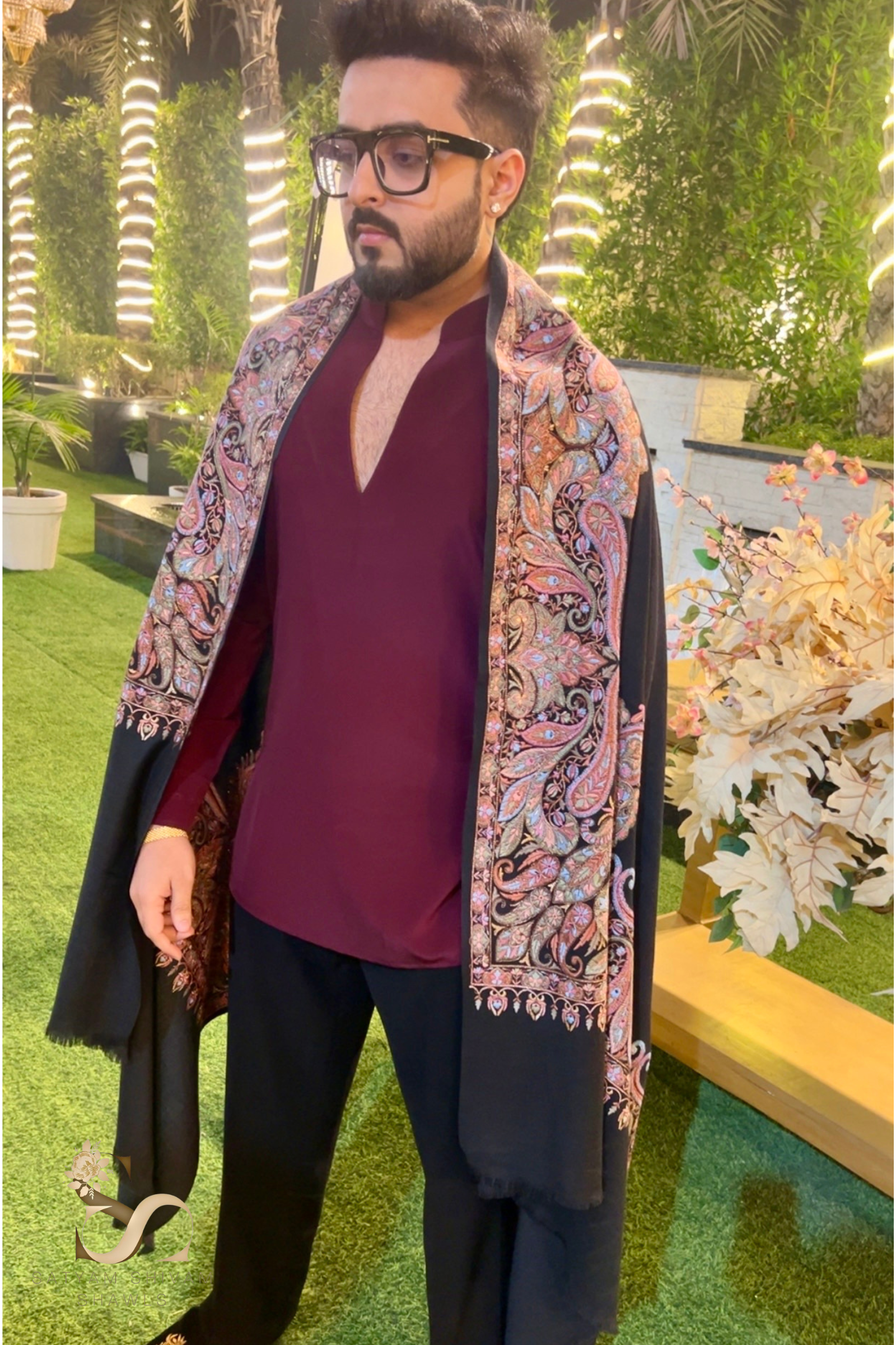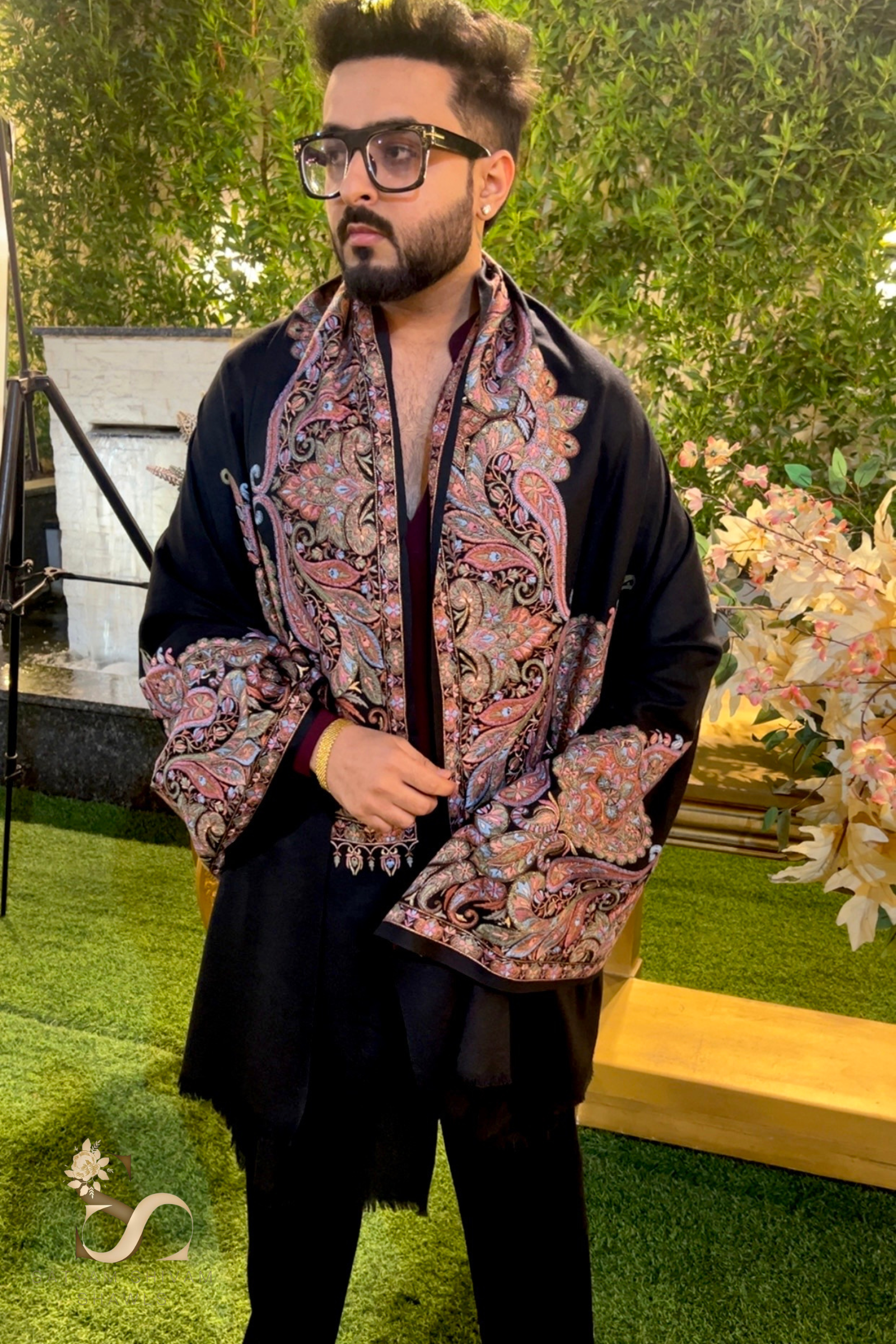 Experience the elegance of "Shikaar-e-Kashmir," a fine pashmina wool shawl adorned with exquisite tilla embroidery. This black shawl offers exceptional warmth and softness, making it perfect for chilly days while adding a touch of traditional craftsmanship to your wardrobe. Its delicate embroidery and luxurious texture provide both comfort and style, supporting you in staying cozy and graceful throughout the season.