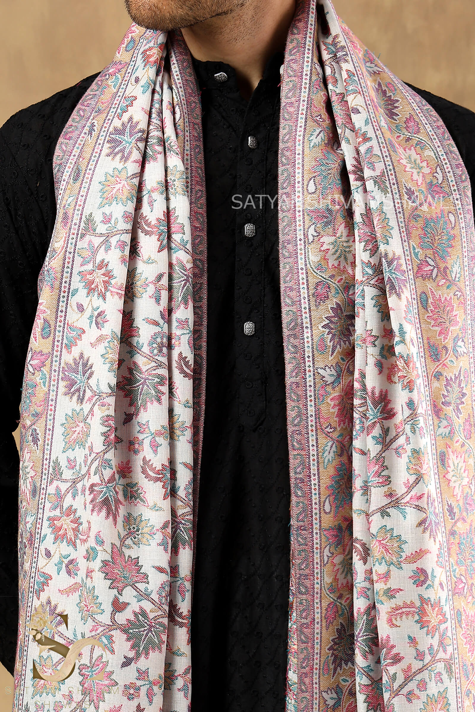 MENS ETHNIC KASHMIRI CHINAR DESIGN KANI SHAWL, Light Weight, Soft And Warm, White
