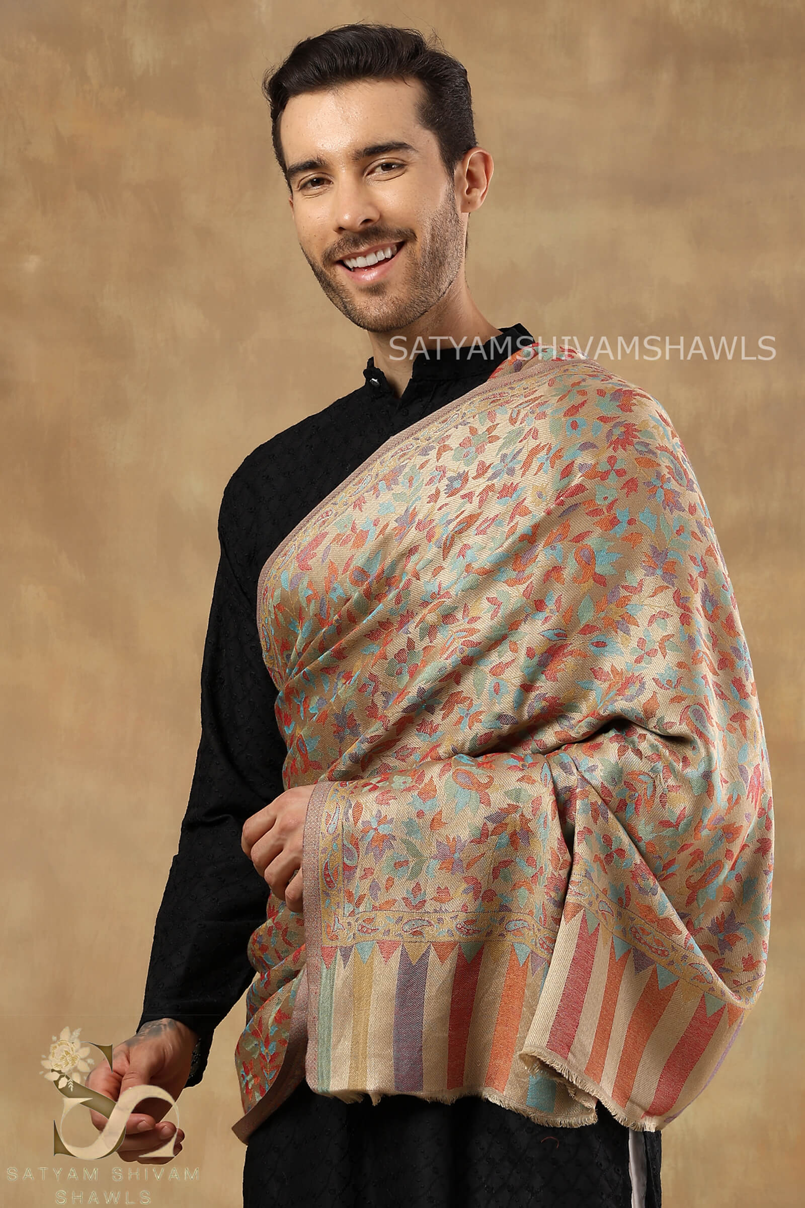 NAAQSH-E-KANI JAMAWAR SILK PASHMINA MENS SHAWLS,BEIGE GOLDEN