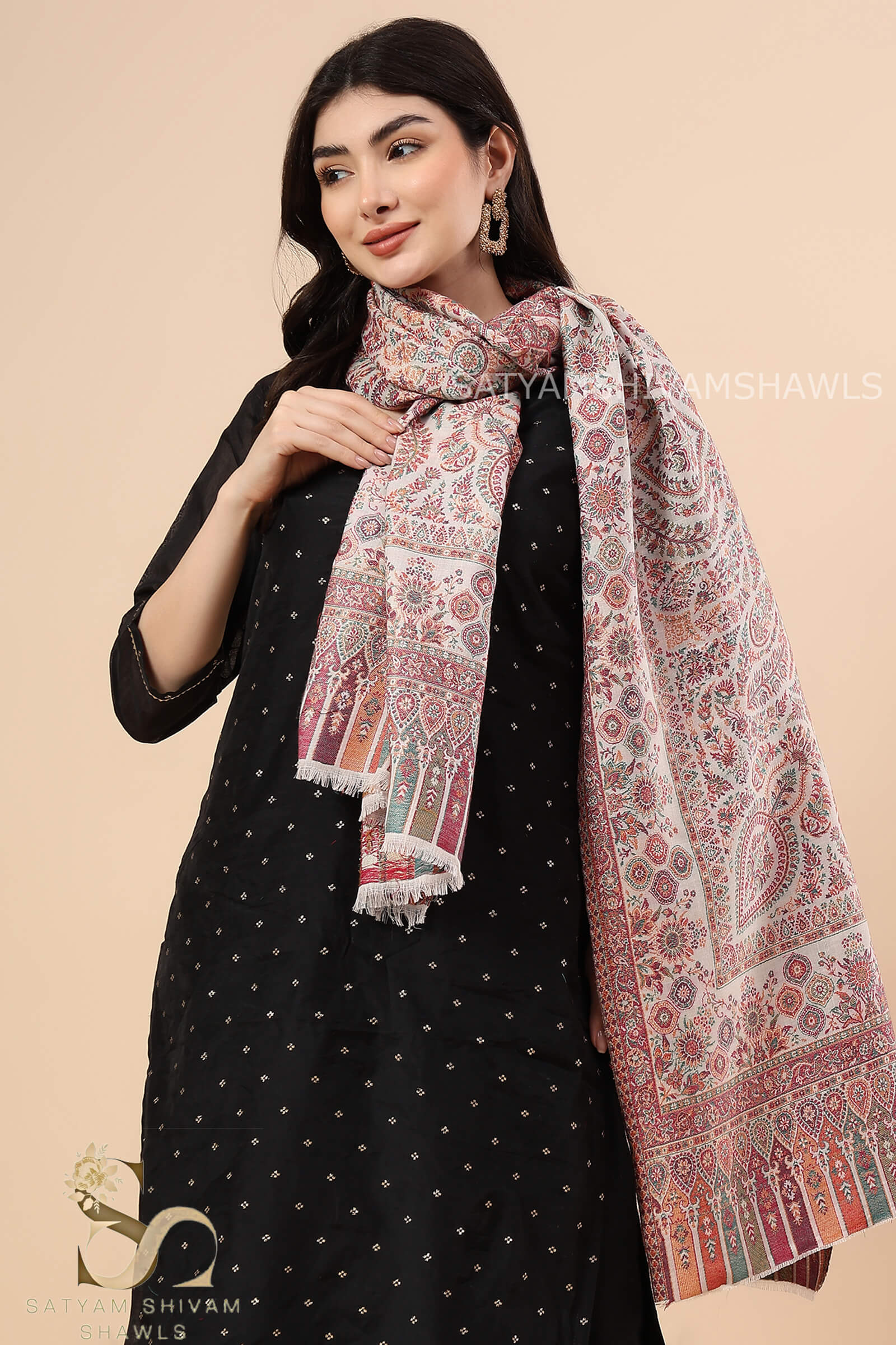 - Wrap yourself in the opulent beauty of this 100% Fine Wool shawl, certified by Woolmark, featuring a woven paisley pattern with an antique jamawar look in a graceful beige hue.