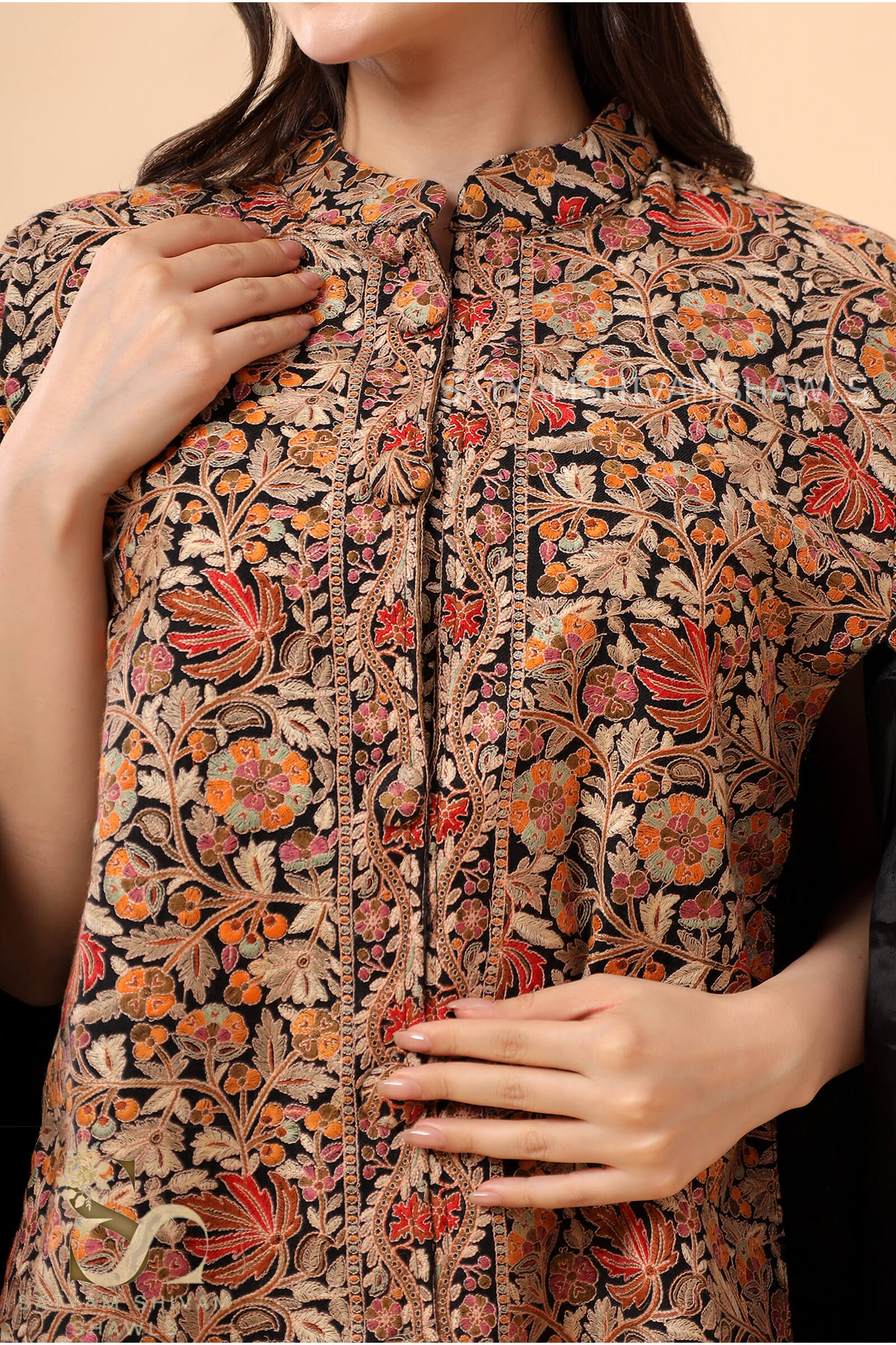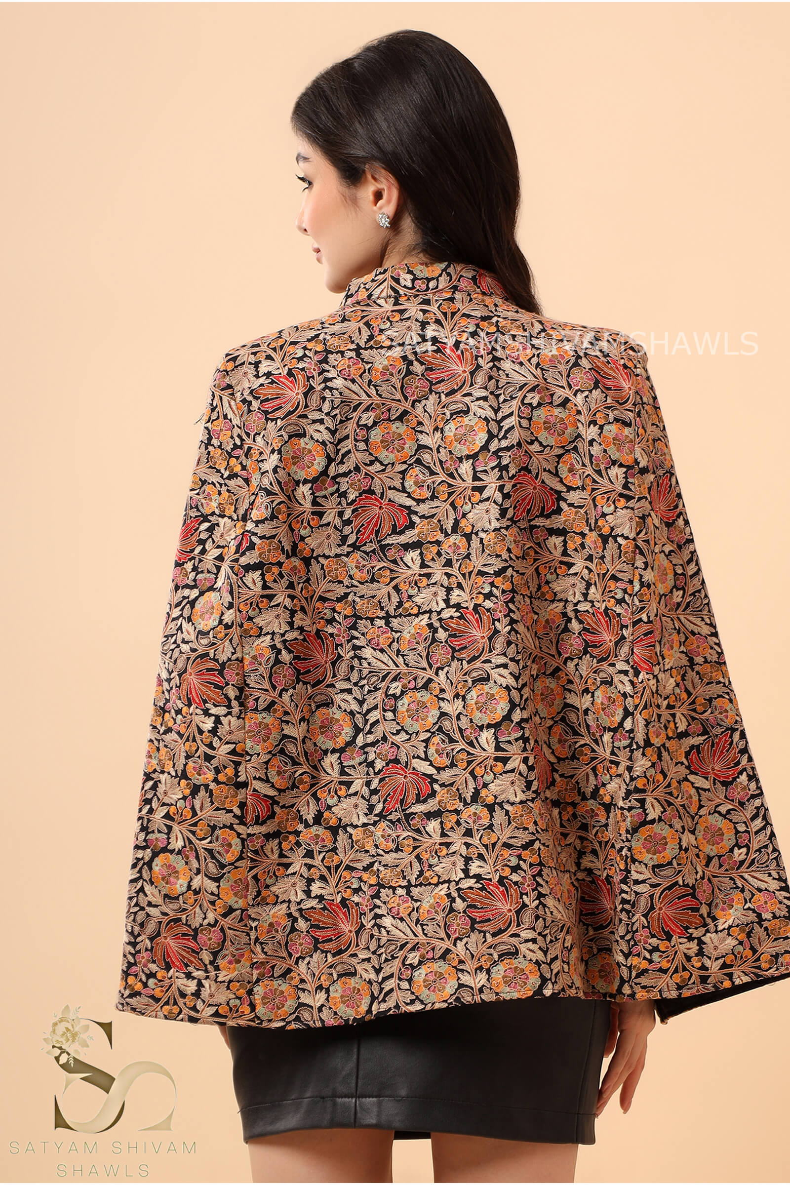 This black Kashmiri Chinar cape is meticulously handcrafted using traditional paper mache techniques, reflecting the rich heritage of Kashmiri artistry. Its unique texture and elegant design provide a sophisticated statement piece that combines cultural authenticity with contemporary fashion. Ideal for connoisseurs of fine craftsmanship seeking a distinctive and lightweight accessory.