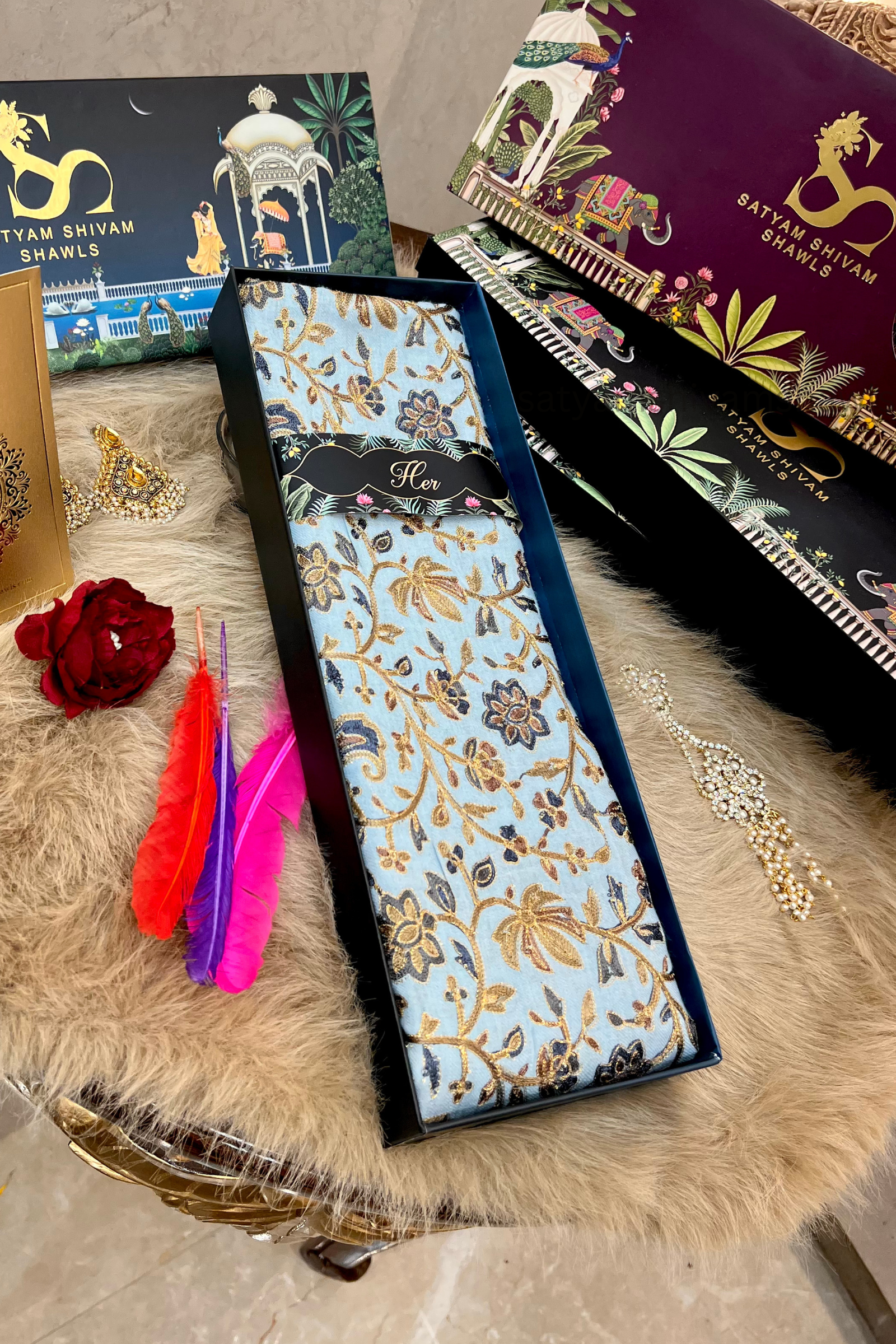 PASHMINA MIST BLUE NALKI EMBRODIERY WEAVE STOLE,WARM & SOFT