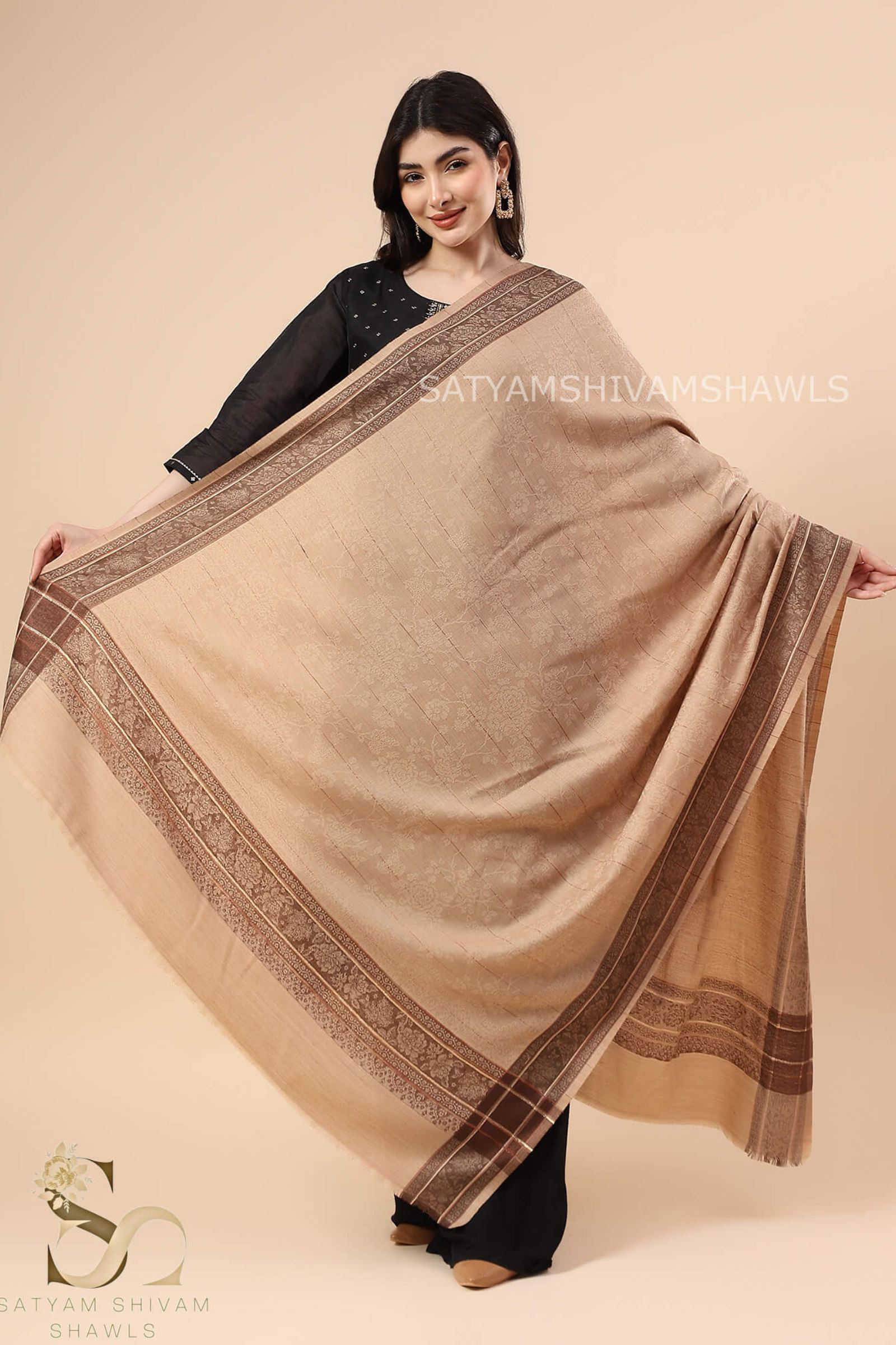 - Wrap yourself in the opulent beauty of this 100% Fine Wool shawl, certified by Woolmark, featuring a woven paisley pattern with an antique jamawar look in a graceful beige hue.