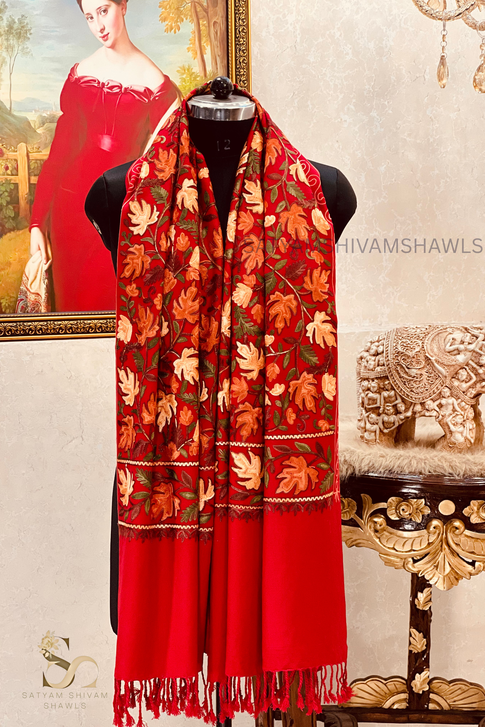 Crafted from pure wool, this Kashmiri stole features exquisite fine Arri embroidery showcasing an antique Chinar leaf design. The rich Mehroon shade enhances its traditional elegance, making it a timeless accessory that offers warmth and refined style. Perfect for connoisseurs of authentic craftsmanship and heritage textiles.