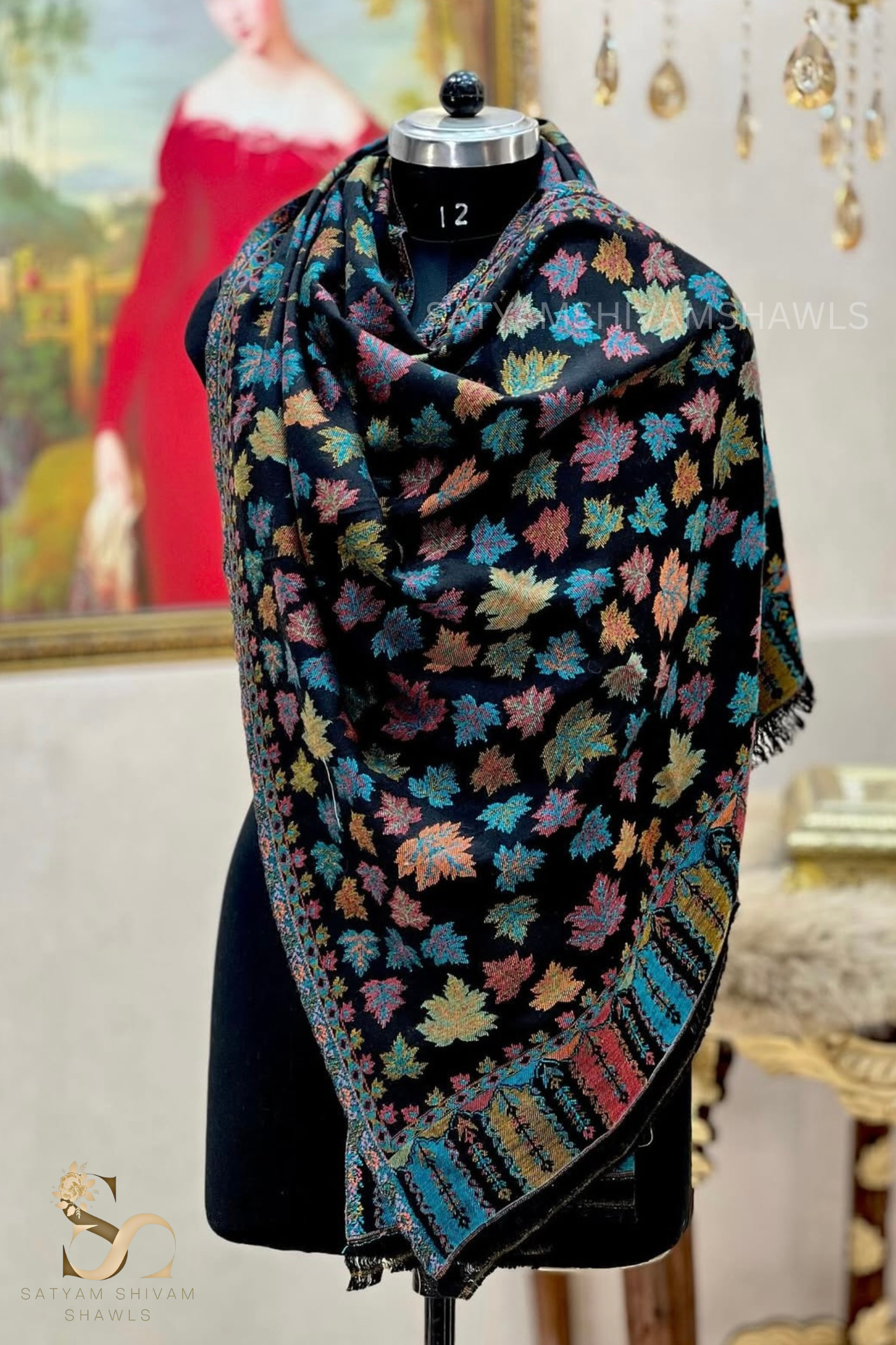 This pure wool multi Chinar Kani design stole exemplifies refined craftsmanship with its intricate patterns inspired by traditional motifs. Woven with high-quality wool, it offers exceptional warmth and softness, making it perfect for both formal occasions and everyday wear. Its multi-colored design adds a sophisticated touch, reflecting cultural heritage while ensuring durability and comfort.