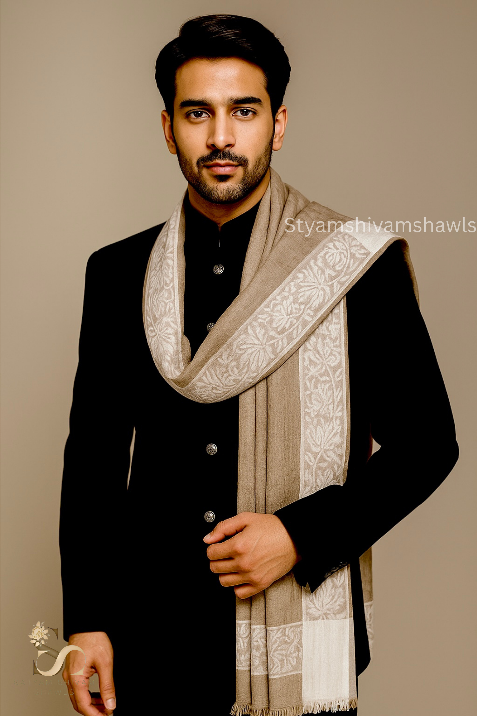 - Wrap yourself in the opulent beauty of this 100% Fine Wool shawl, certified by Woolmark, featuring a woven paisley pattern with an antique jamawar look in a graceful beige hue.