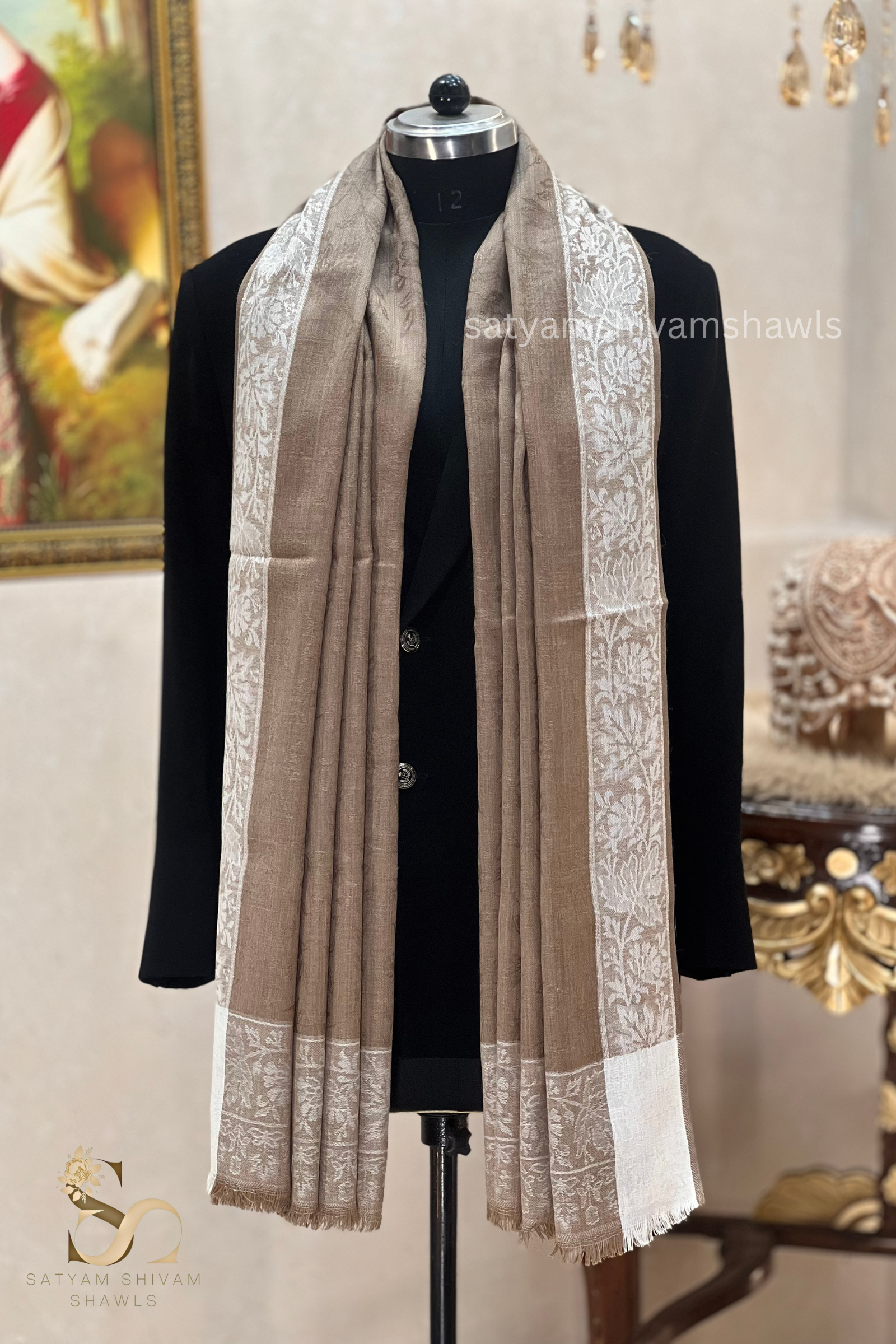 - Wrap yourself in the opulent beauty of this 100% Fine Wool shawl, certified by Woolmark, featuring a woven paisley pattern with an antique jamawar look in a graceful beige hue.