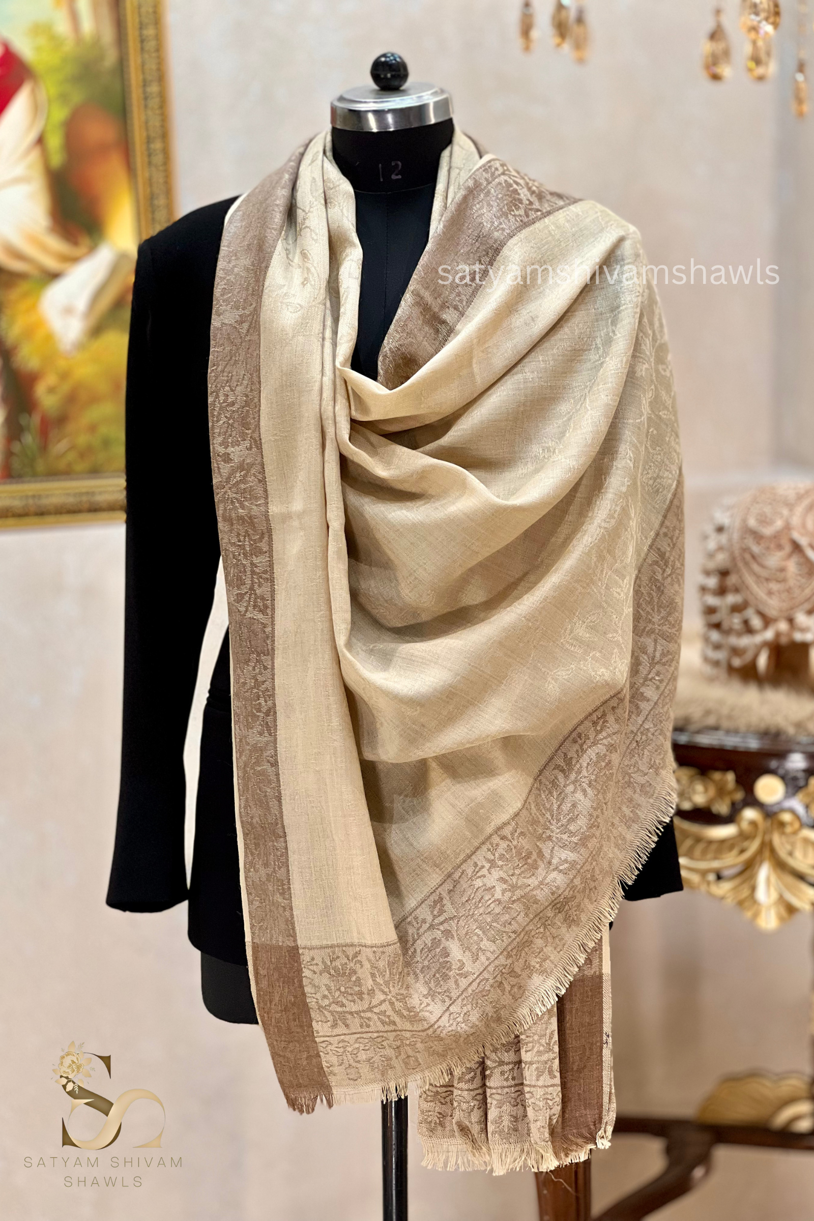 - Wrap yourself in the opulent beauty of this 100% Fine Wool shawl, certified by Woolmark, featuring a woven paisley pattern with an antique jamawar look in a graceful beige hue.