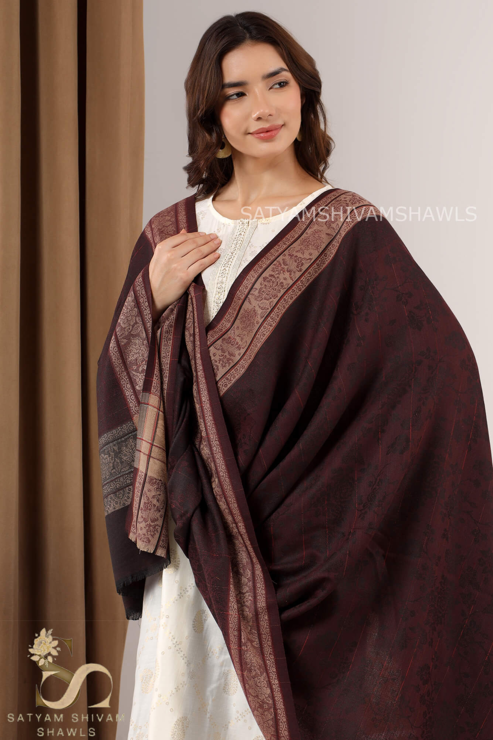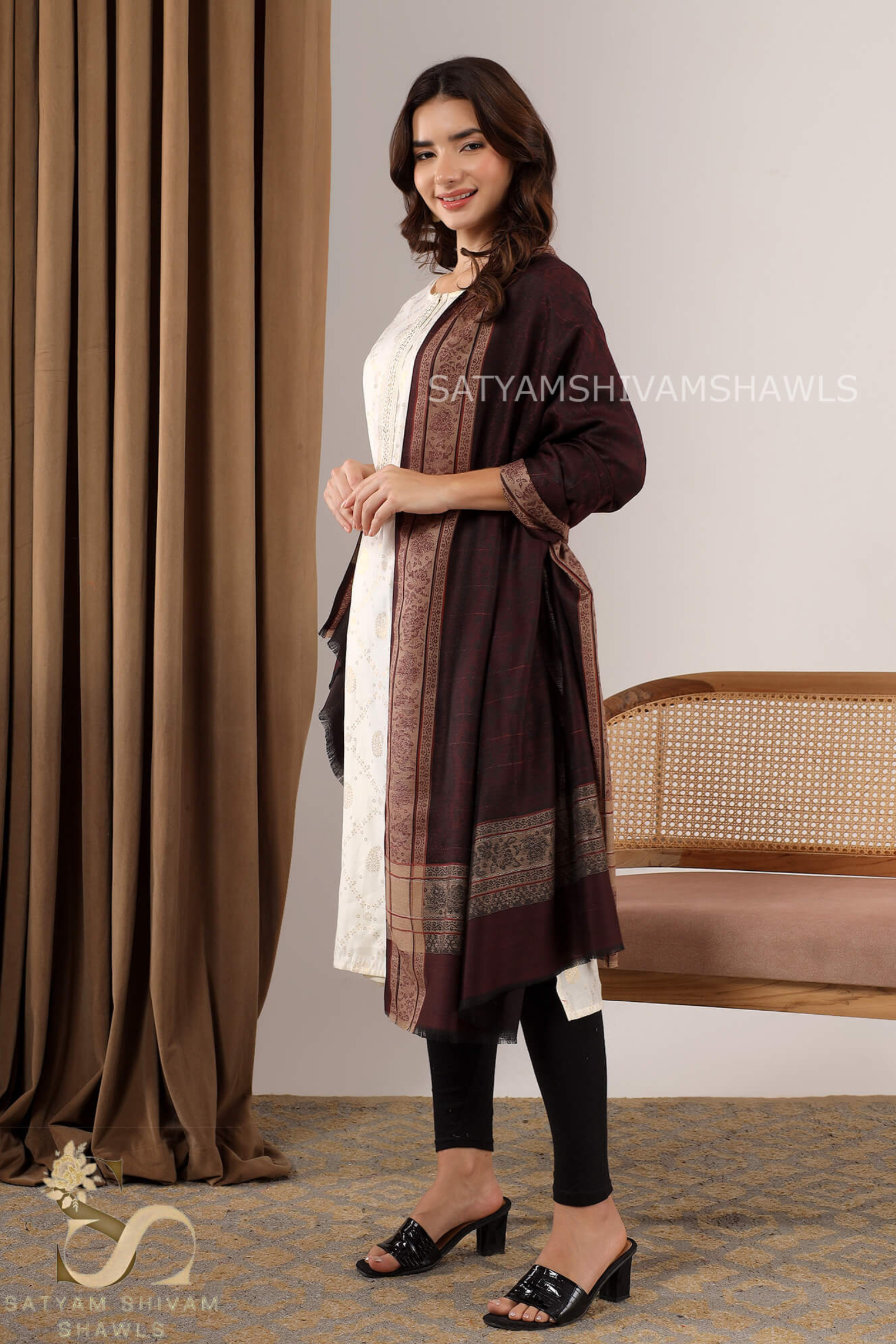 This wine-colored shawl, crafted from pure wool, features subtle self stripes and a distinctive border design that enhances its classic appeal. Offering exceptional warmth and a soft texture, it is expertly woven to provide comfort and durability. Ideal for elevating your winter wardrobe with a touch of refined elegance.