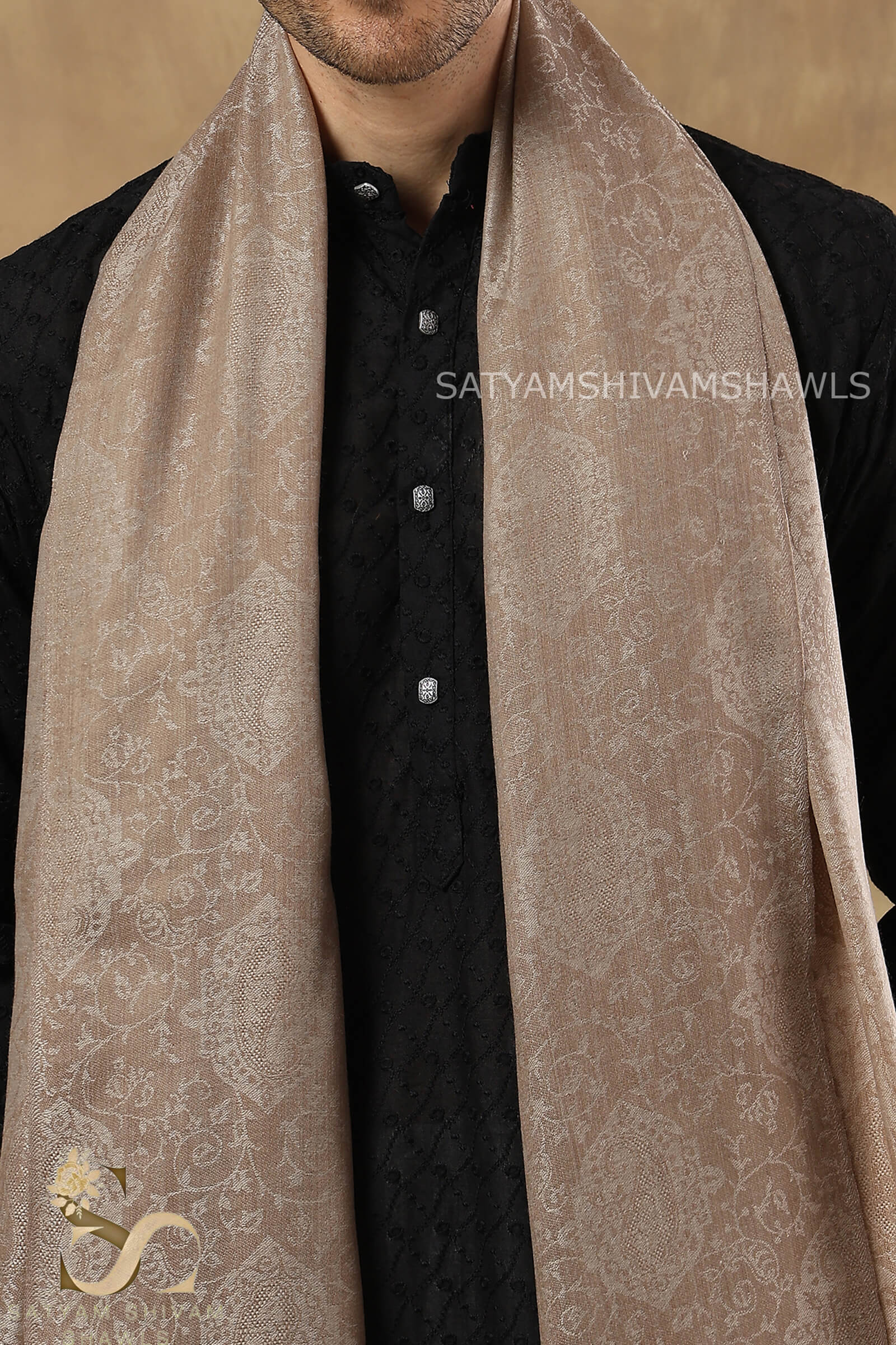 This Royal Luxury Pashmina Ring Pass is a distinguished Kashmiri shawl designed for gentlemen. Made from authentic pashmina wool, it showcases a refined self-design in an elegant toosh colour. Combining traditional craftsmanship with luxurious softness, this shawl offers both warmth and sophistication, making it an essential accessory for a polished and classic look.