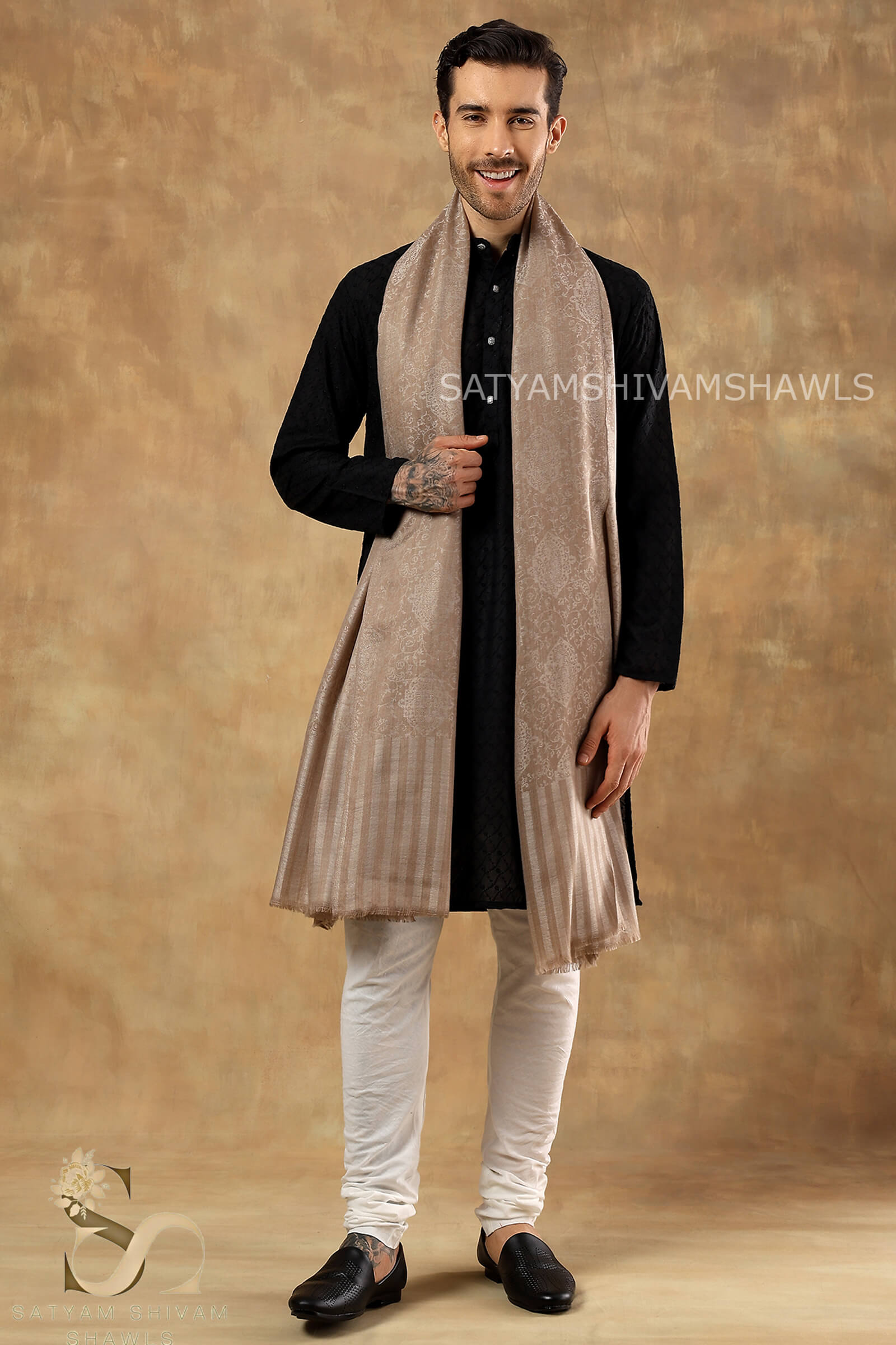 - Wrap yourself in the opulent beauty of this 100% Fine Wool shawl, certified by Woolmark, featuring a woven paisley pattern with an antique jamawar look in a graceful beige hue.