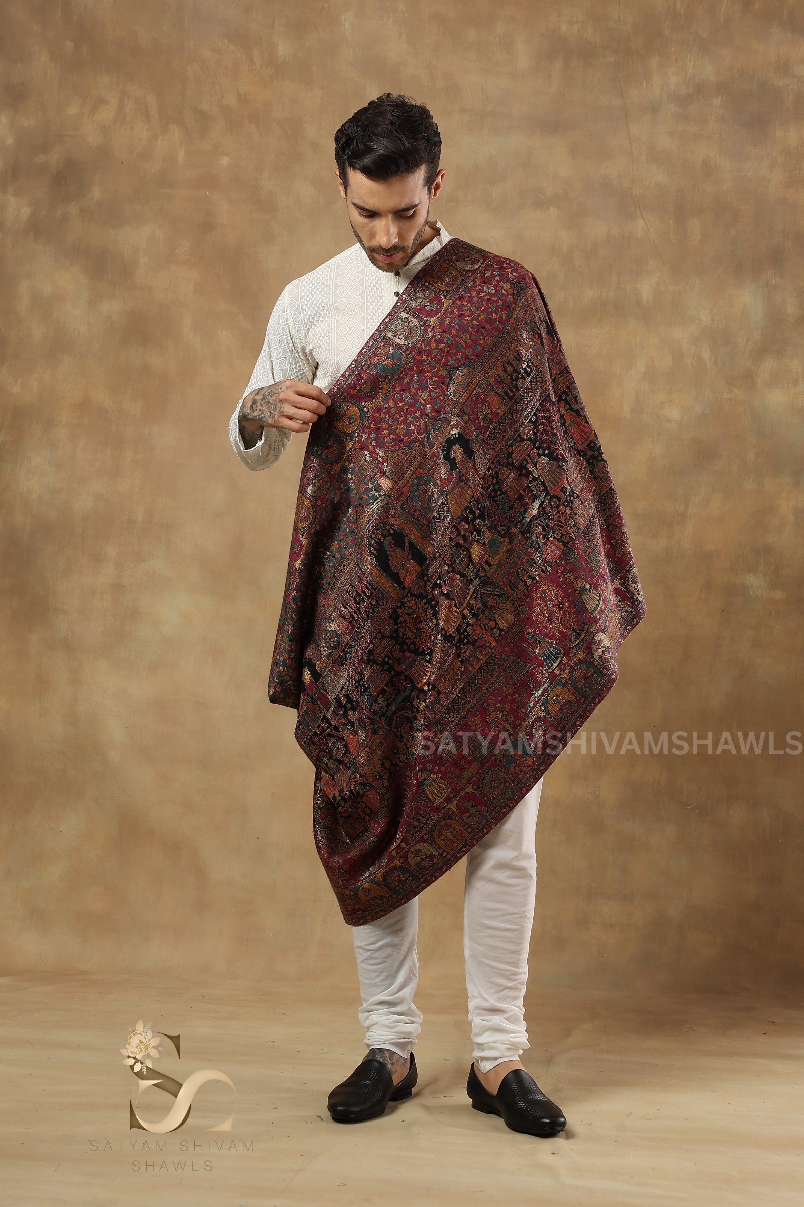 The "Shaan-E-Darbar" men's stole features exquisite Kani weaving on a rich black pashmina blend wool fabric. This stole expertly combines traditional craftsmanship with premium materials, providing both warmth and a distinguished aesthetic. Ideal for formal occasions, it enhances your ensemble with subtle elegance and cultural depth, reflecting timeless heritage in every thread.