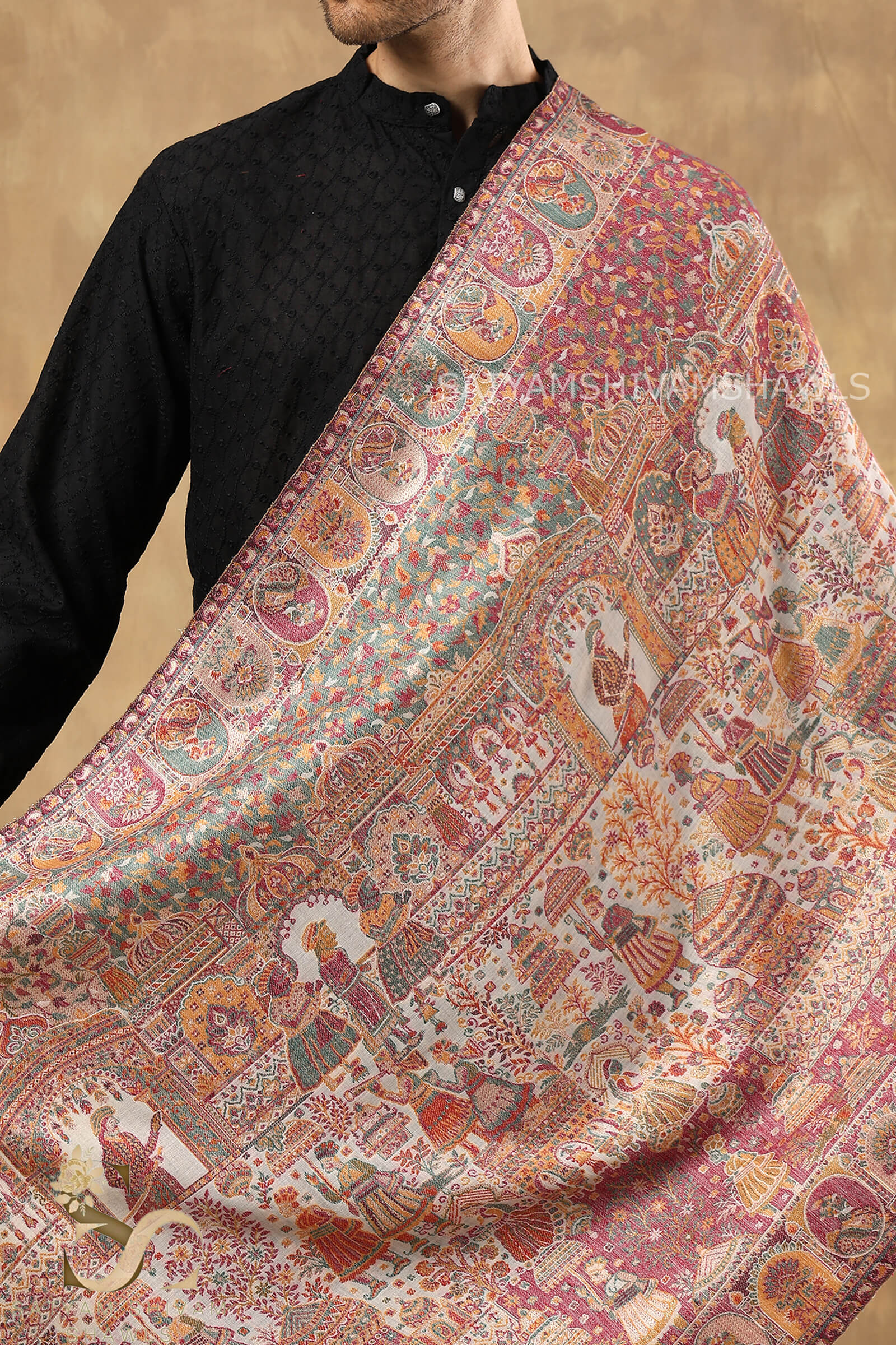 "SHAAN -E-DARBAR" THEME KANI PASHMINA BLEND WOOL MENS STOLES, WHITE