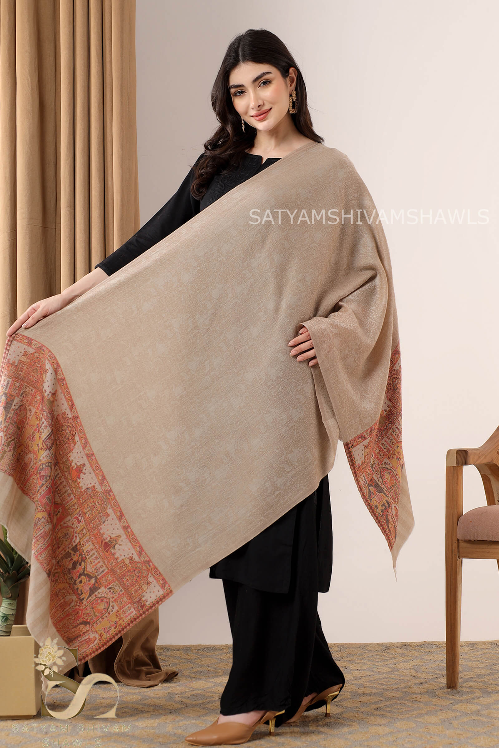 - Wrap yourself in the opulent beauty of this 100% Fine Wool shawl, certified by Woolmark, featuring a woven paisley pattern with an antique jamawar look in a graceful beige hue.