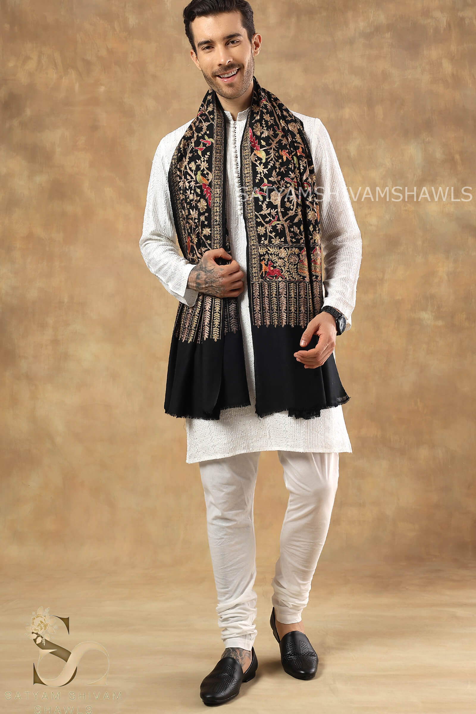 "SHIKAAR-E-KASHMIR" TILLA EMBROIDERY FINE PASHMINA WOOL MENS SHAWLS , WARM AND SOFT,BLACK