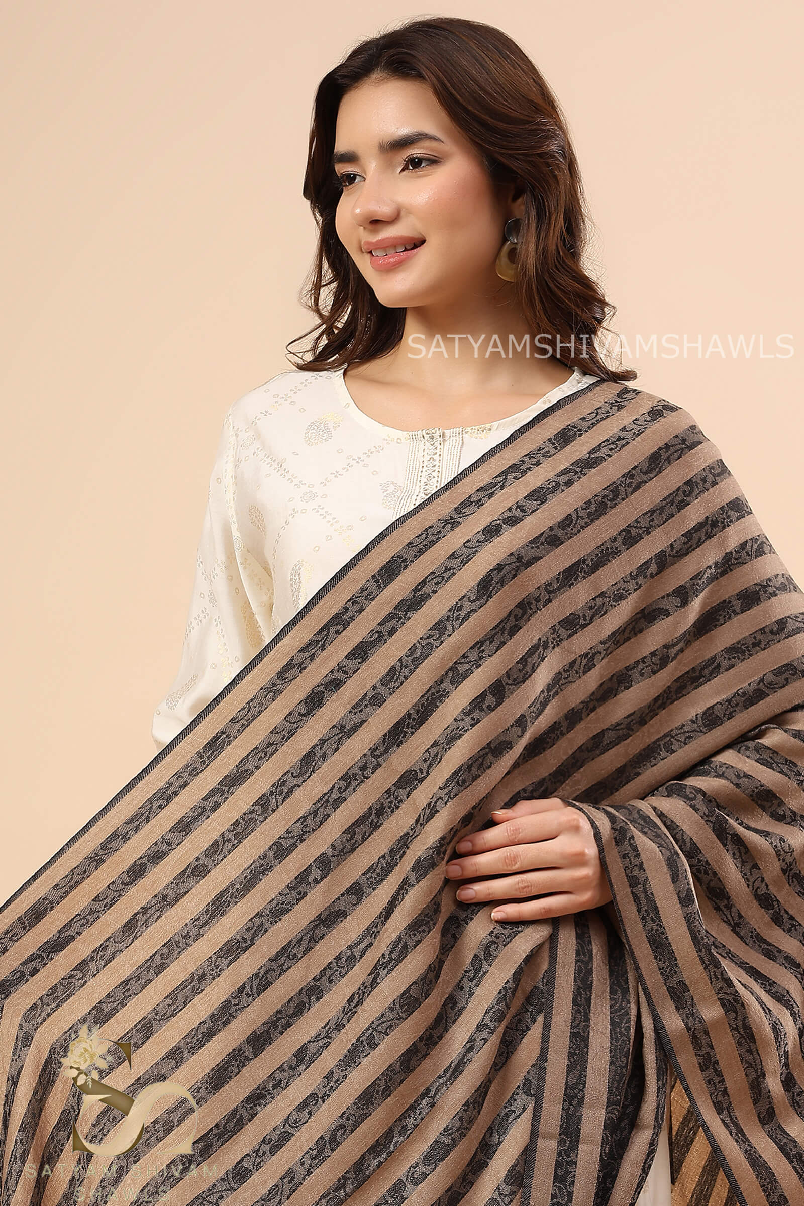 - Wrap yourself in the opulent beauty of this 100% Fine Wool shawl, certified by Woolmark, featuring a woven paisley pattern with an antique jamawar look in a graceful beige hue.