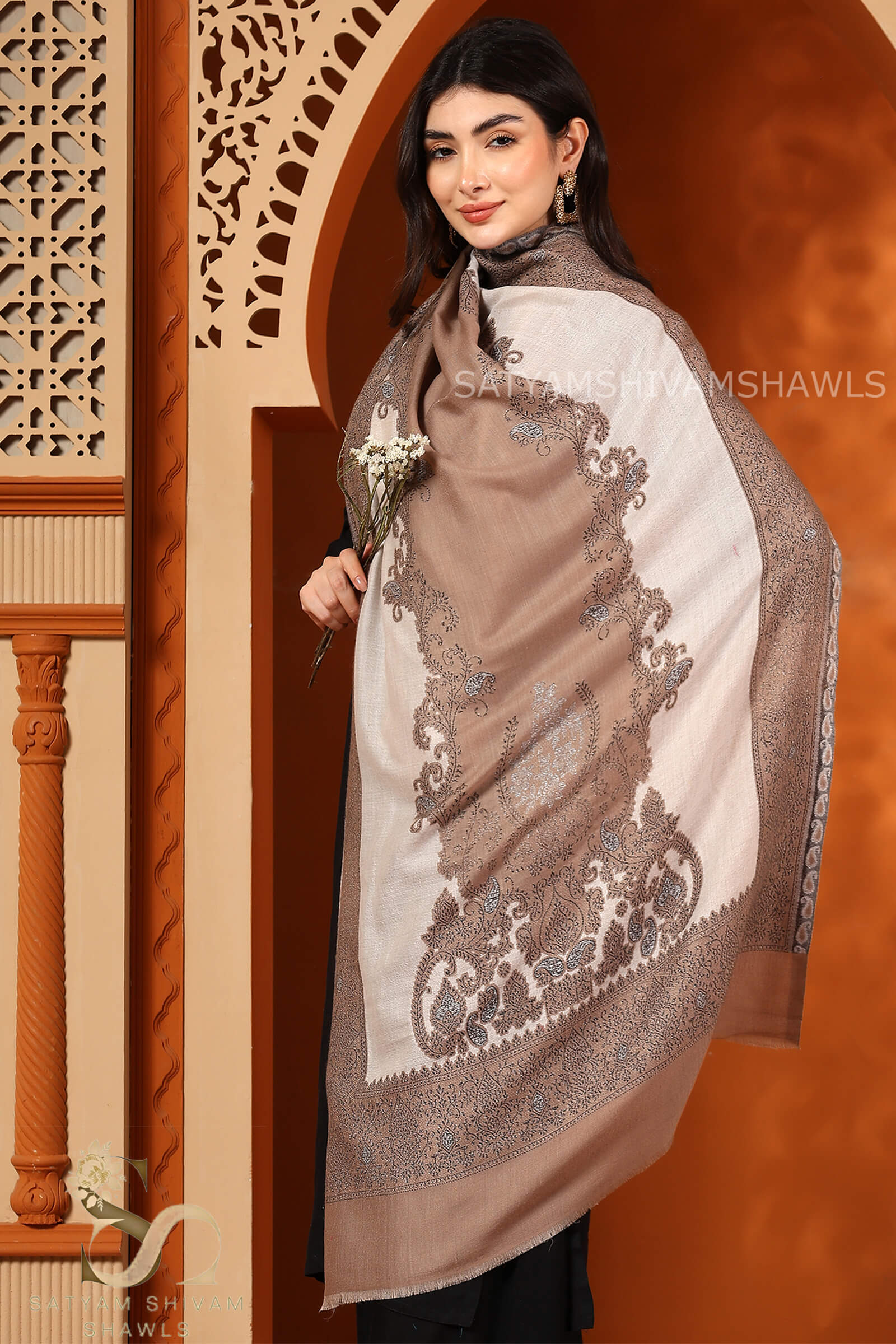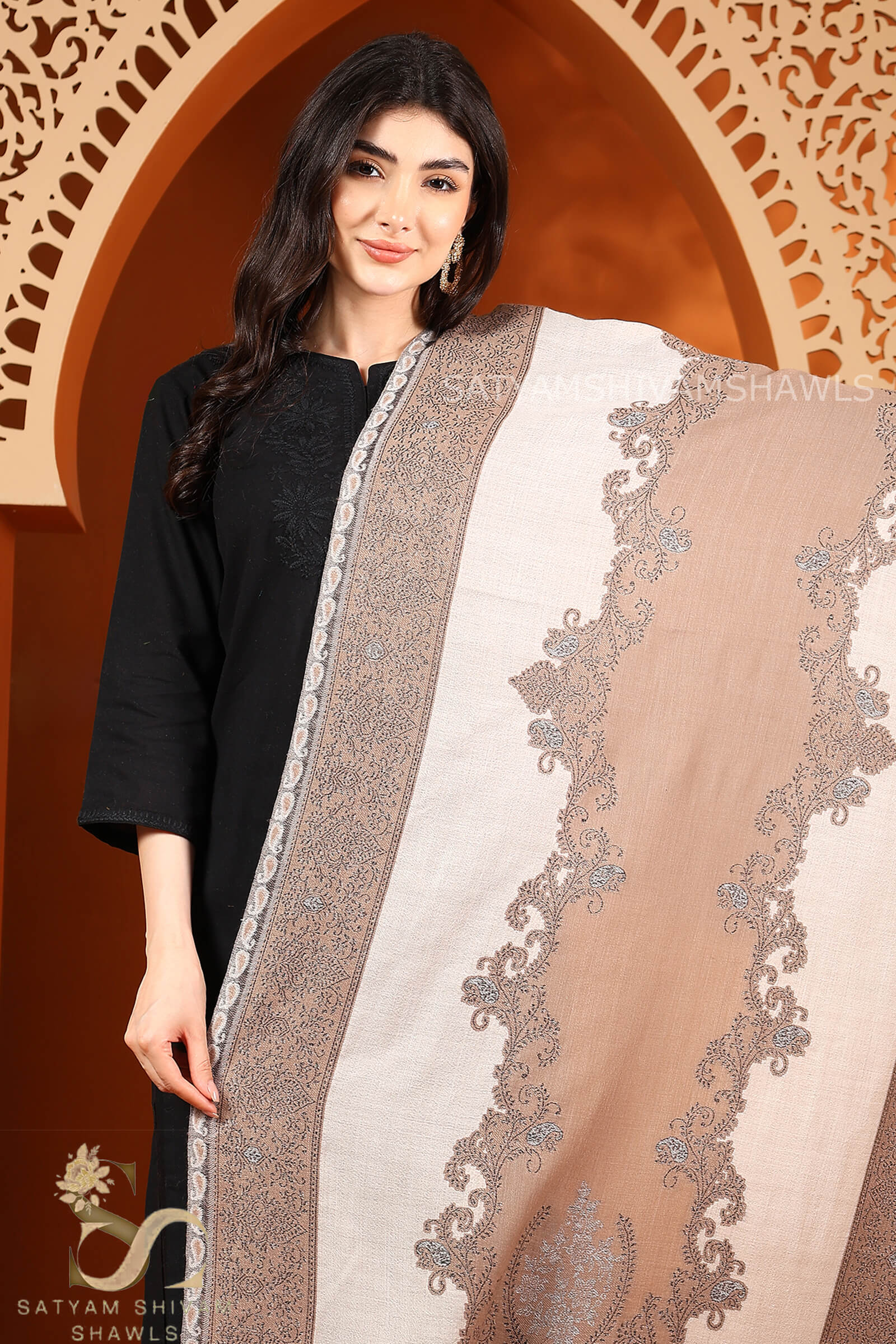 - Wrap yourself in the opulent beauty of this 100% Fine Wool shawl, certified by Woolmark, featuring a woven paisley pattern with an antique jamawar look in a graceful beige hue.