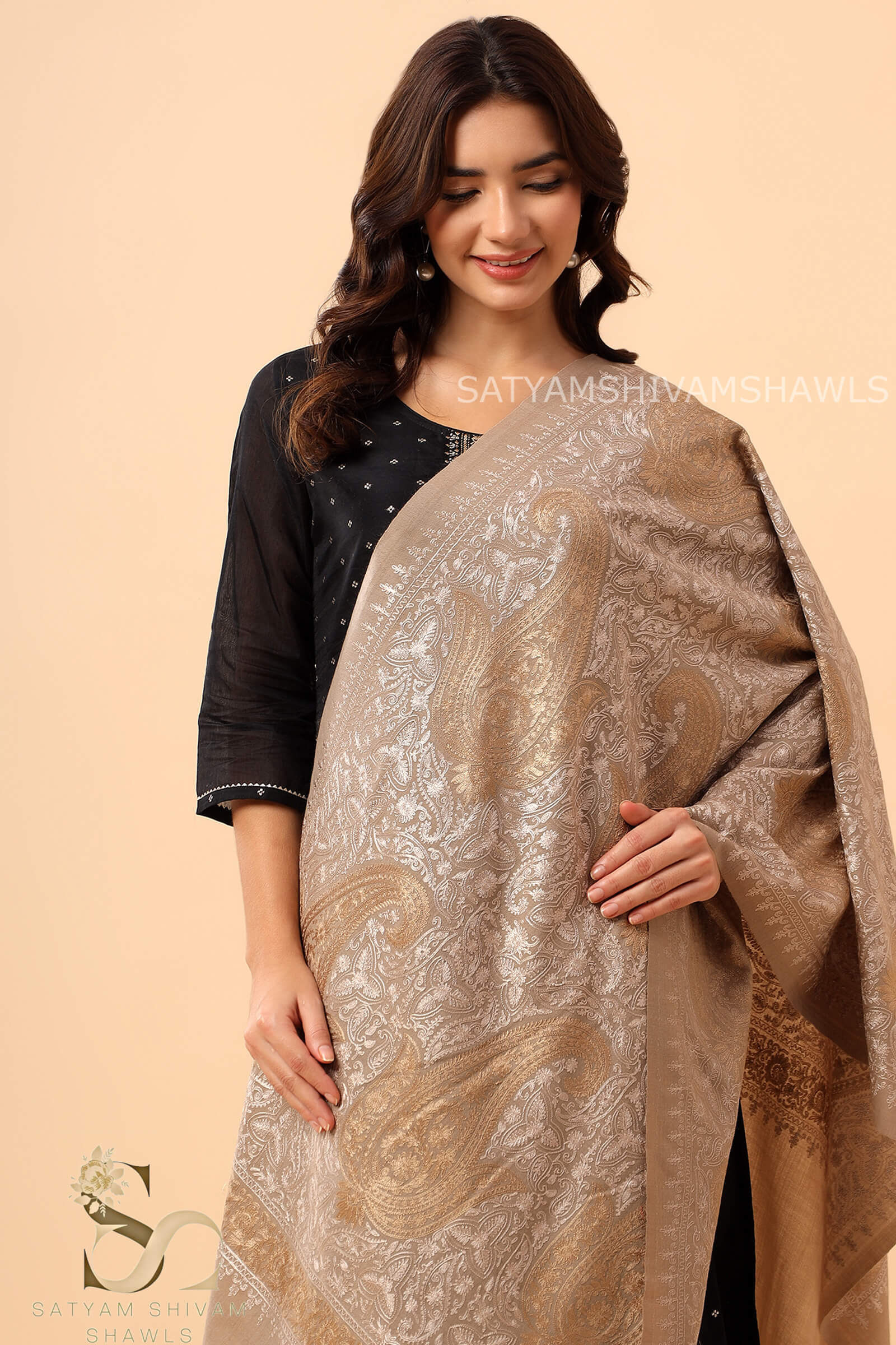 - Wrap yourself in the opulent beauty of this 100% Fine Wool shawl, certified by Woolmark, featuring a woven paisley pattern with an antique jamawar look in a graceful beige hue.