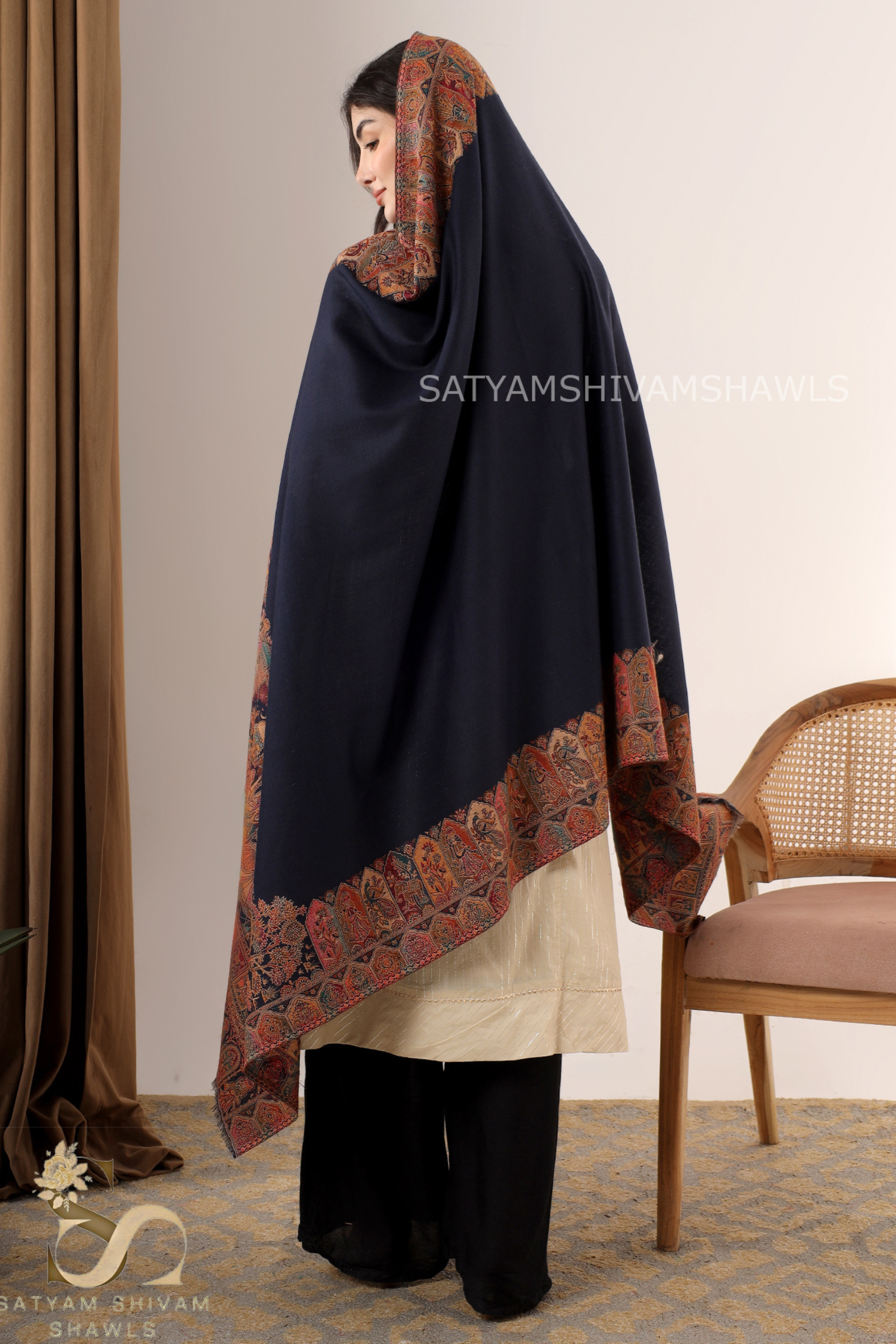 TAJ SAKHIYAAN KANI BORDER WEAVE SHAWL, SOFT, WARM AND LIGHT WEIGHT,NAVY BLUE